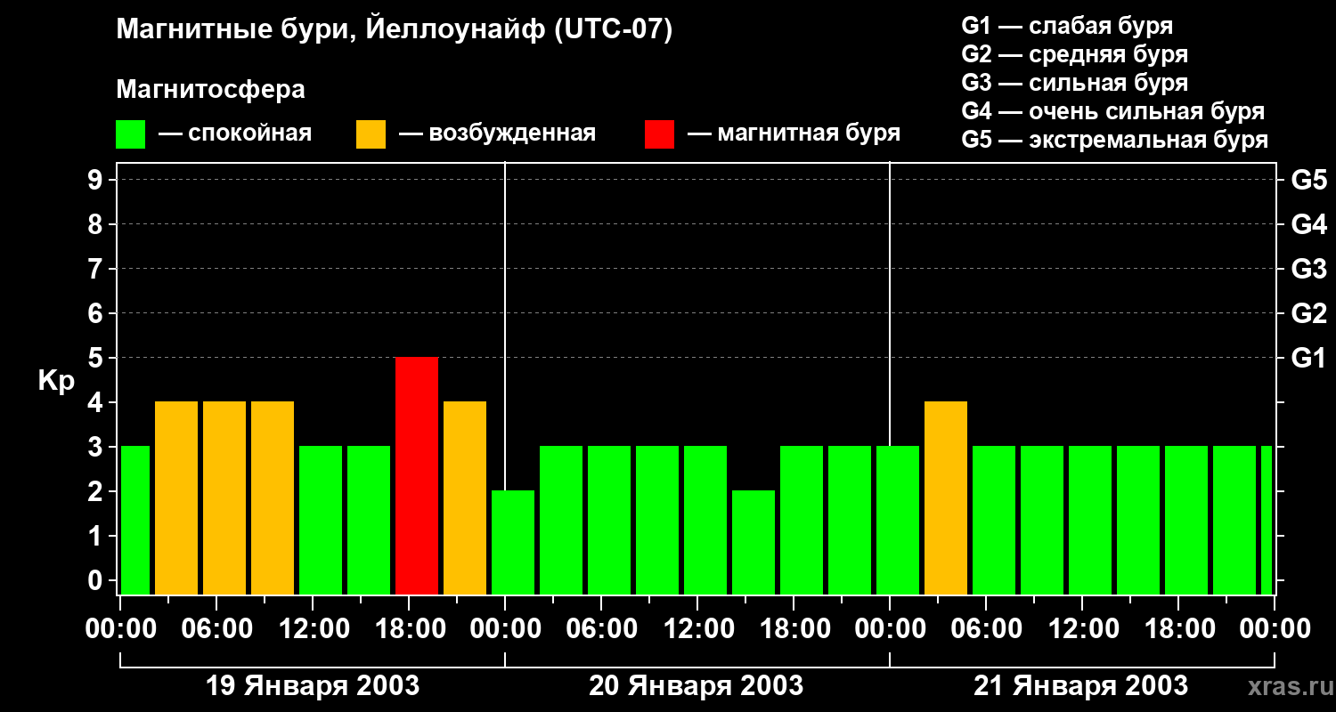 Изменения геомагнитного индекса Kp с 19 по 21 января 2003 года для средних широт