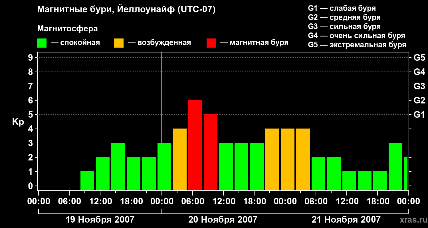 Изменения геомагнитного индекса Kp с 19 по 21 ноября 2007 года для средних широт