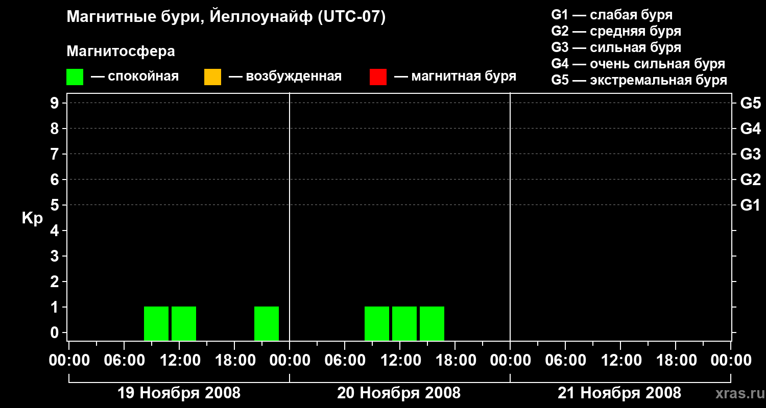 Изменения геомагнитного индекса Kp с 19 по 21 ноября 2008 года для средних широт