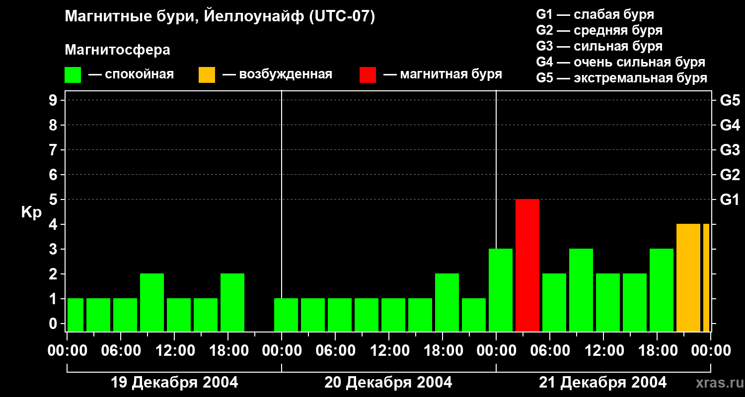 Изменения геомагнитного индекса Kp с 19 по 21 декабря 2004 года для средних широт