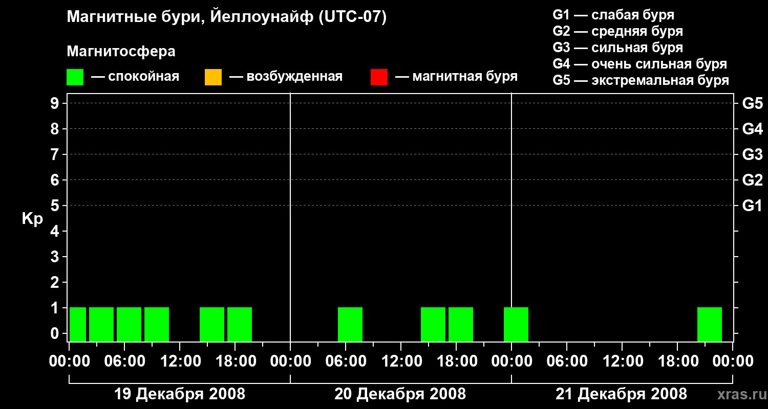 Изменения геомагнитного индекса Kp с 19 по 21 декабря 2008 года для средних широт