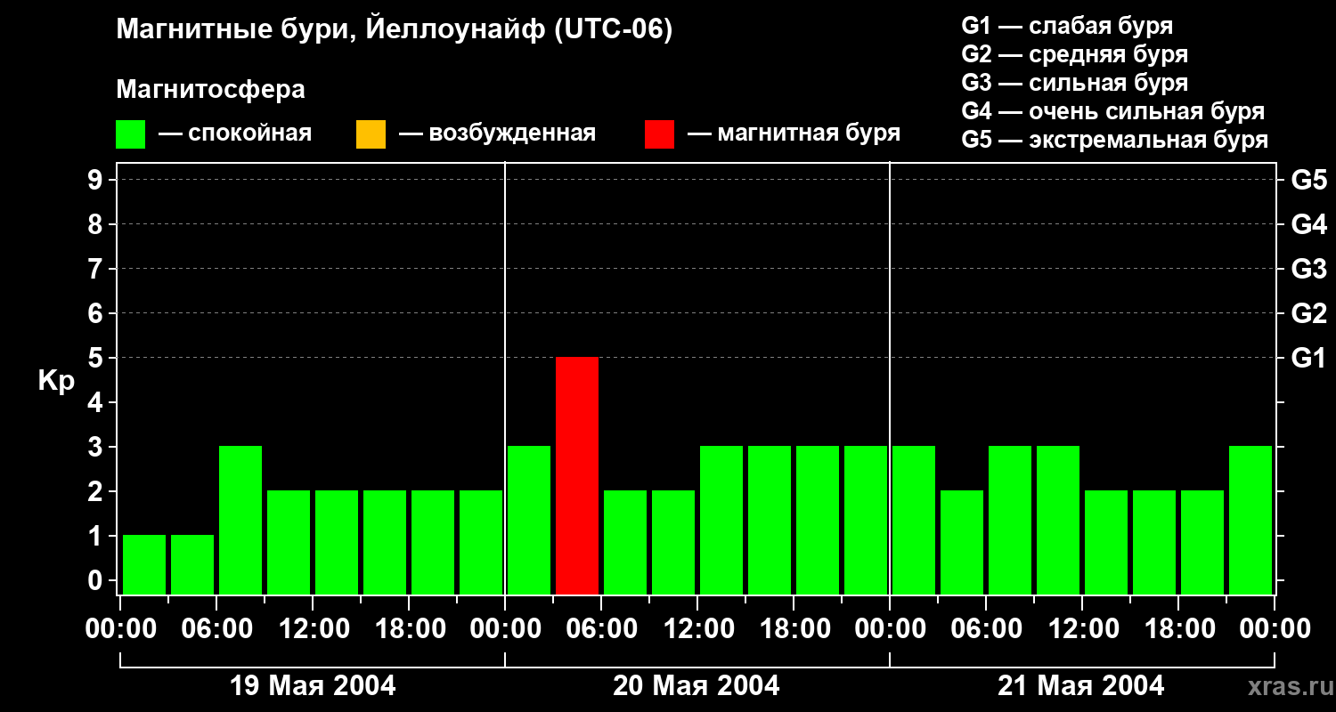 Изменения геомагнитного индекса Kp с 19 по 21 мая 2004 года для средних широт
