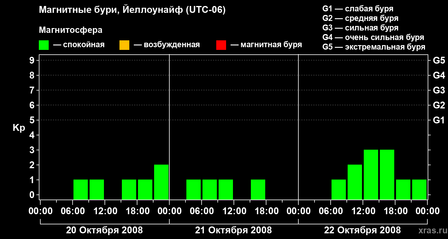 Изменения геомагнитного индекса Kp с 20 по 22 октября 2008 года для средних широт