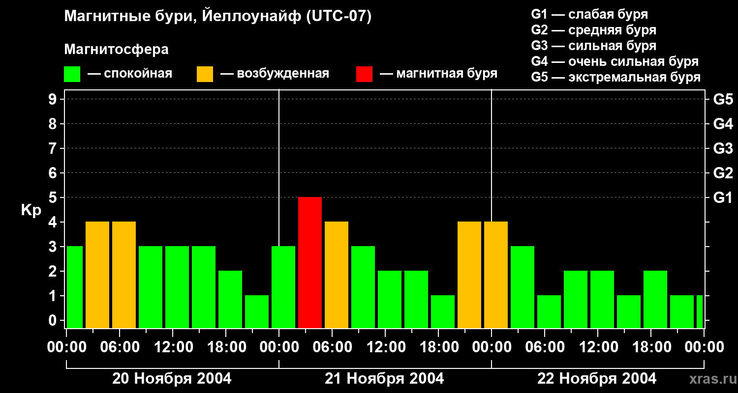 Изменения геомагнитного индекса Kp с 20 по 22 ноября 2004 года для средних широт