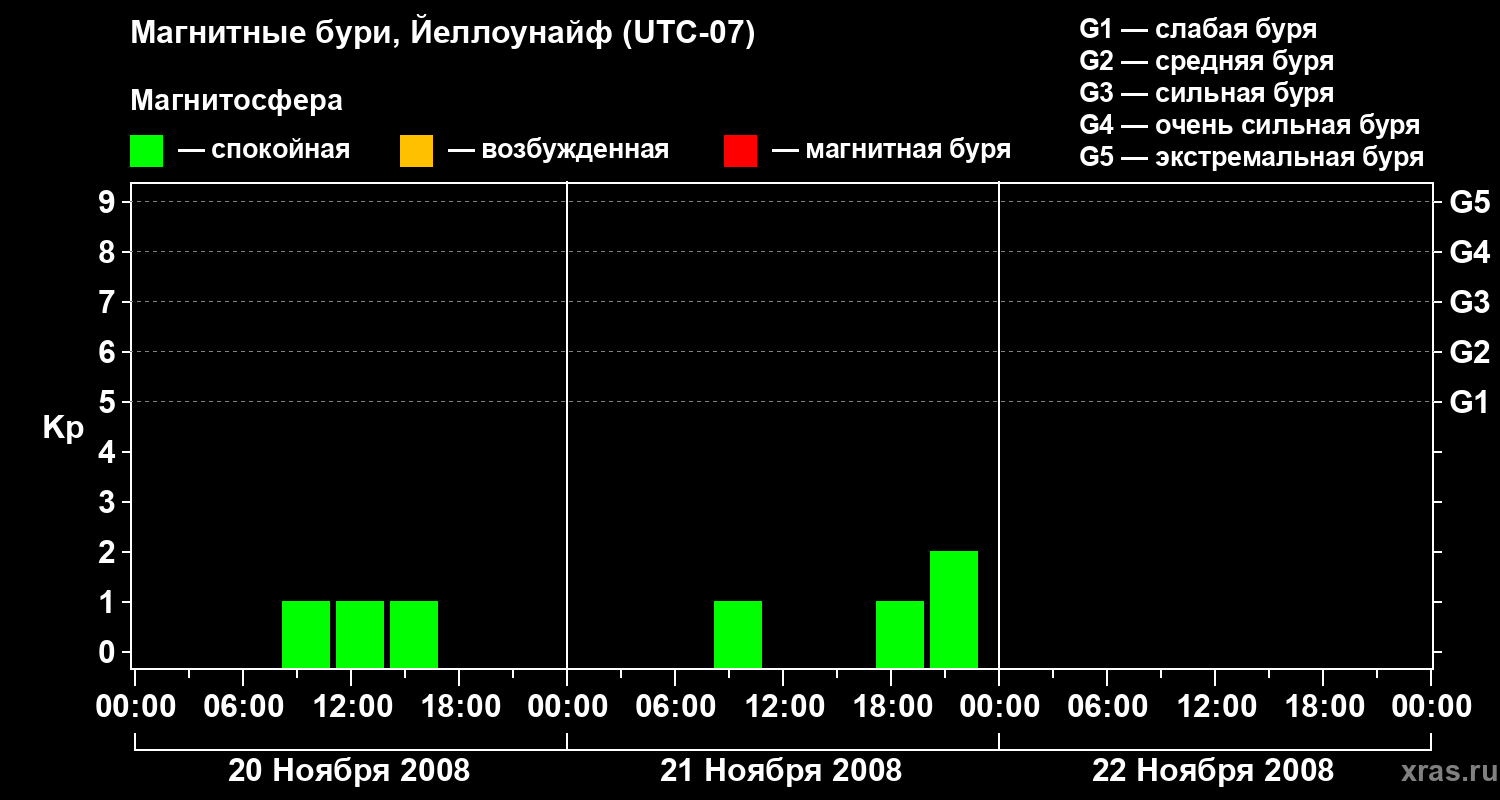 Изменения геомагнитного индекса Kp с 20 по 22 ноября 2008 года для средних широт