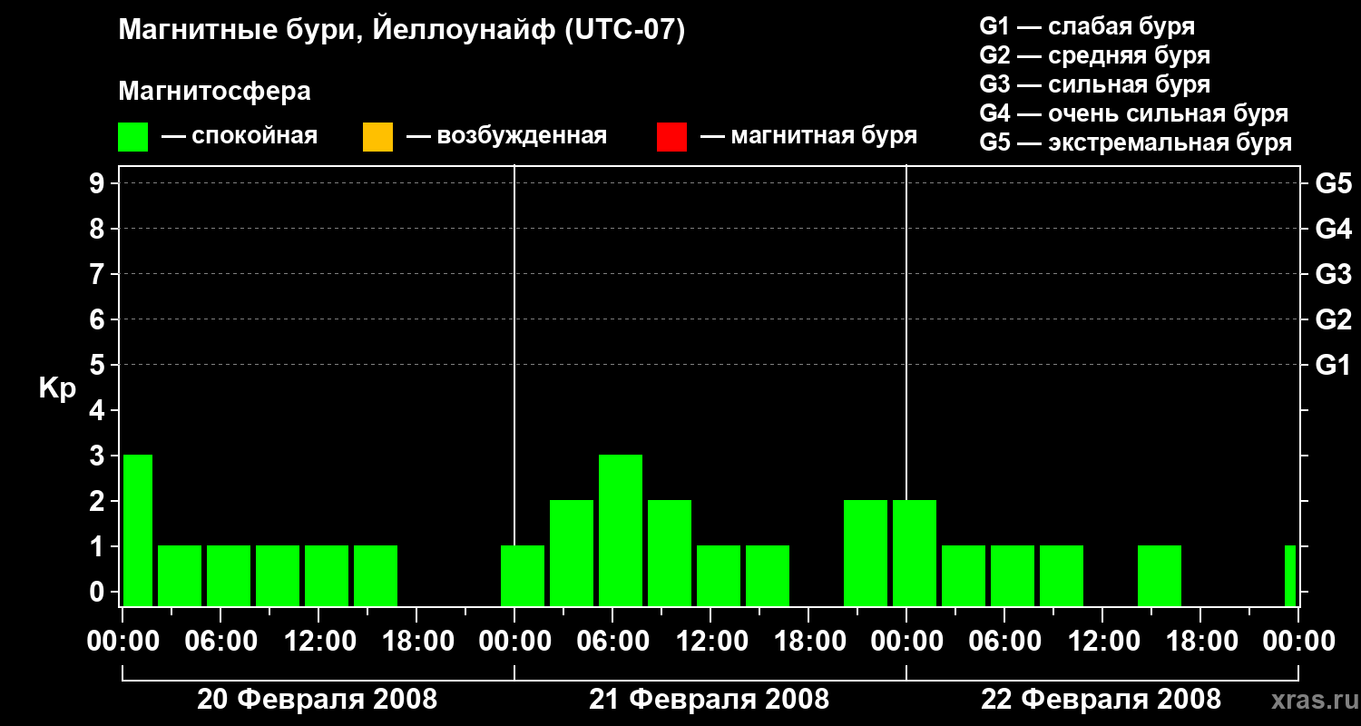 Изменения геомагнитного индекса Kp с 20 по 22 февраля 2008 года для средних широт