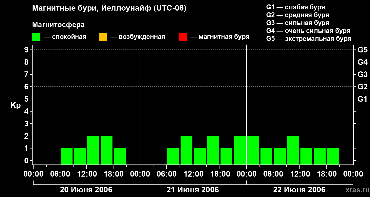 Изменения геомагнитного индекса Kp с 20 по 22 июня 2006 года для средних широт