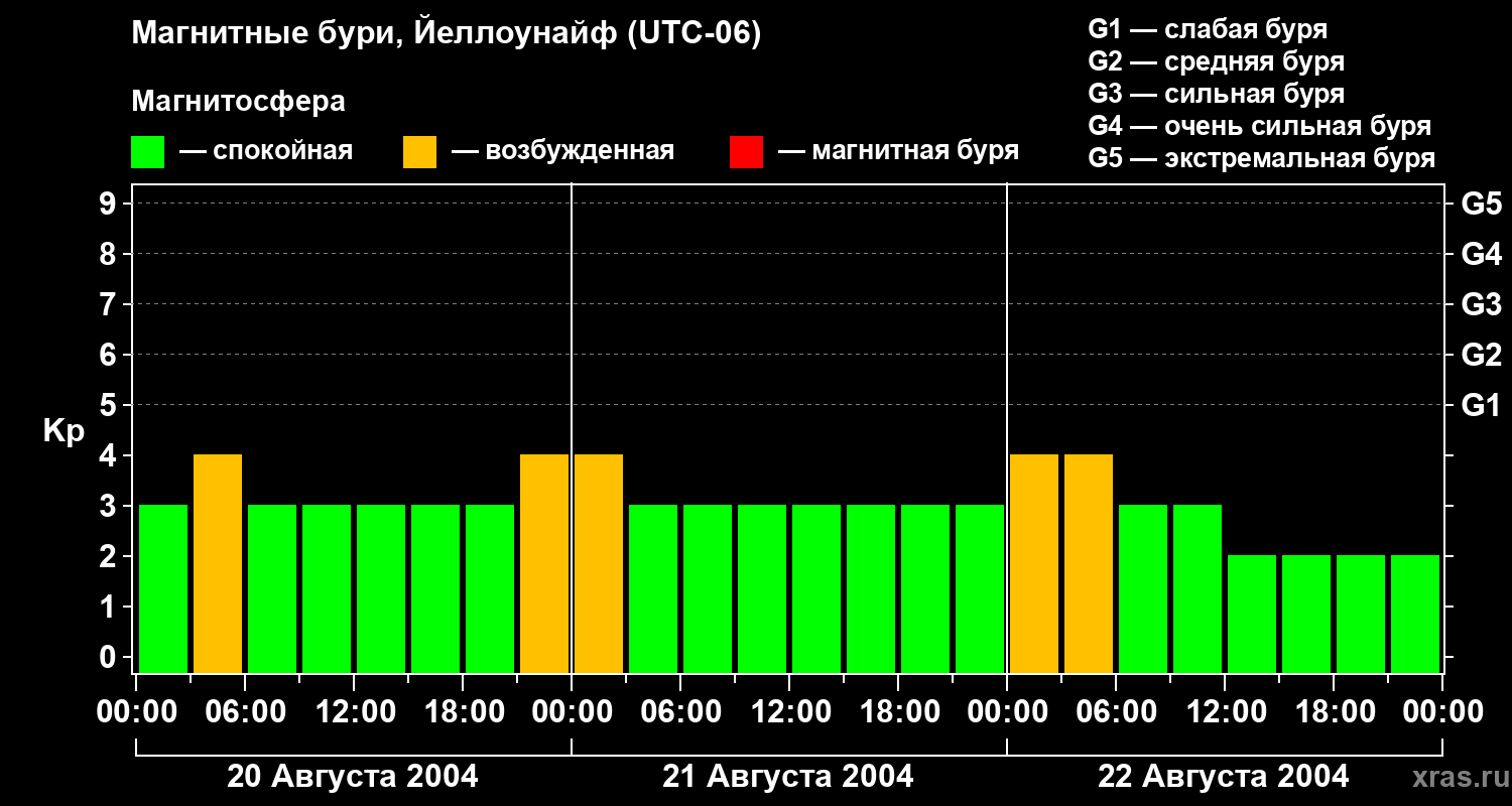 Изменения геомагнитного индекса Kp с 20 по 22 августа 2004 года для средних широт