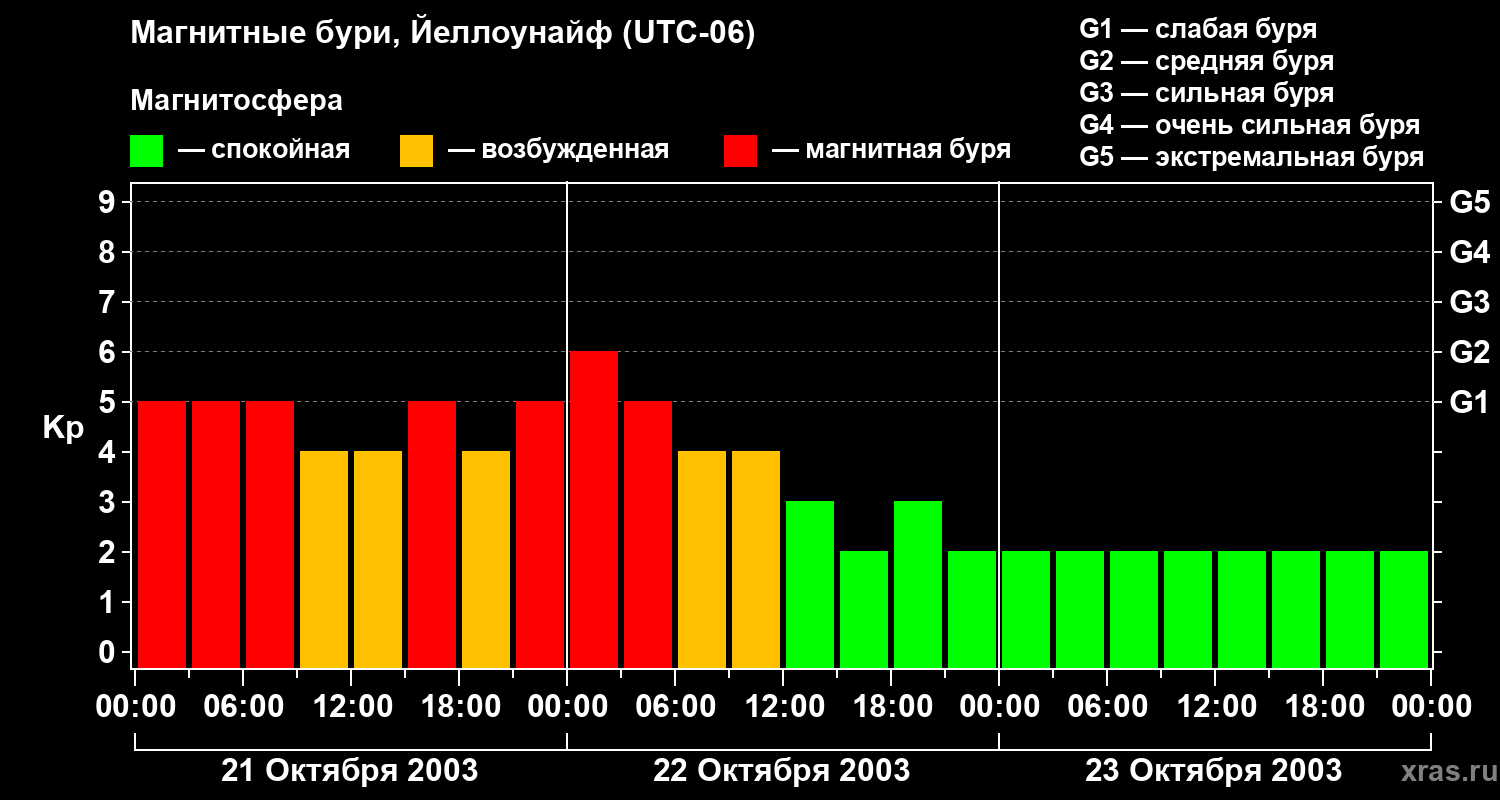 Изменения геомагнитного индекса Kp с 21 по 23 октября 2003 года для средних широт