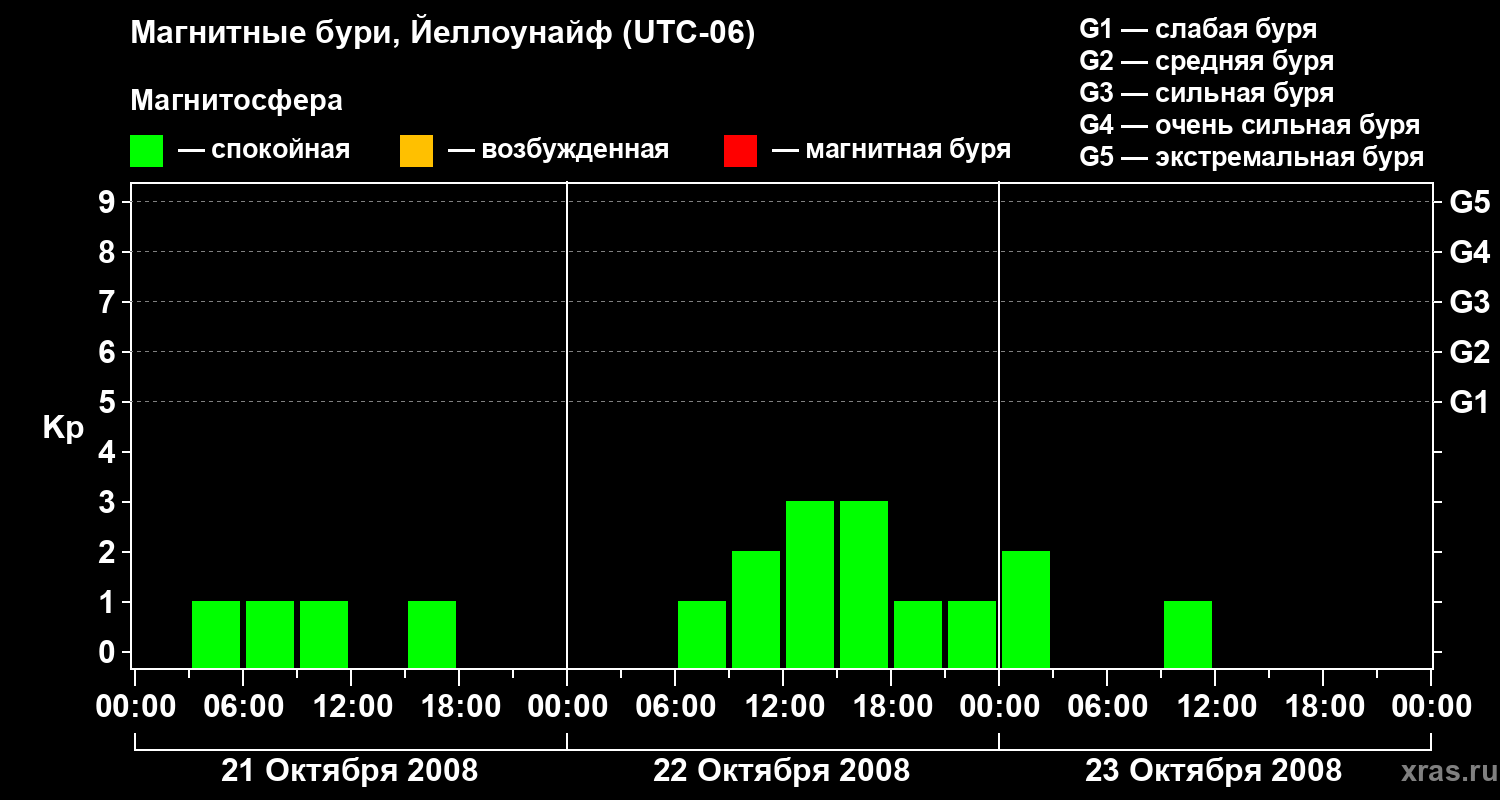 Изменения геомагнитного индекса Kp с 21 по 23 октября 2008 года для средних широт