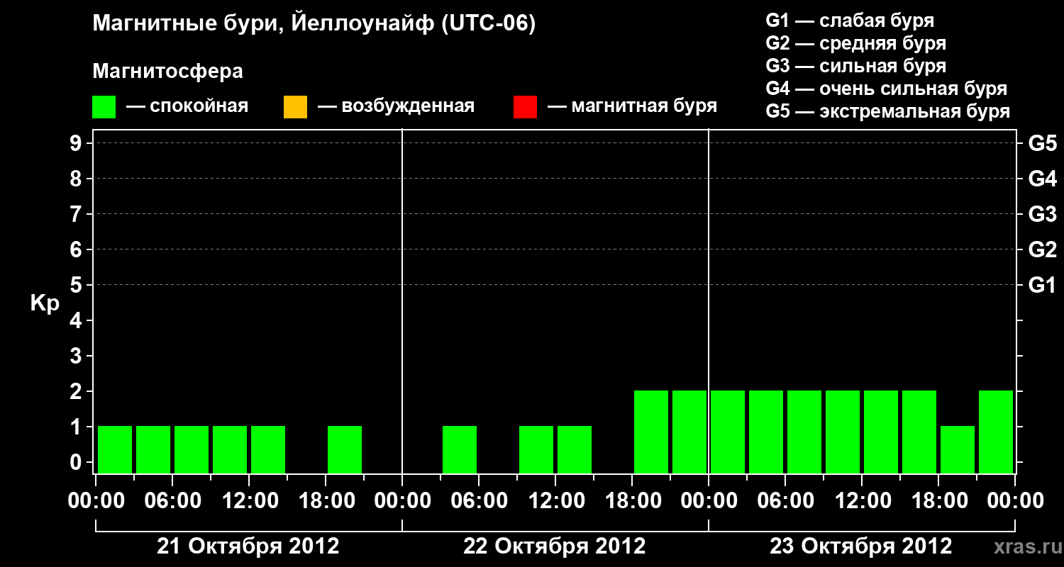 Изменения геомагнитного индекса Kp с 21 по 23 октября 2012 года для средних широт