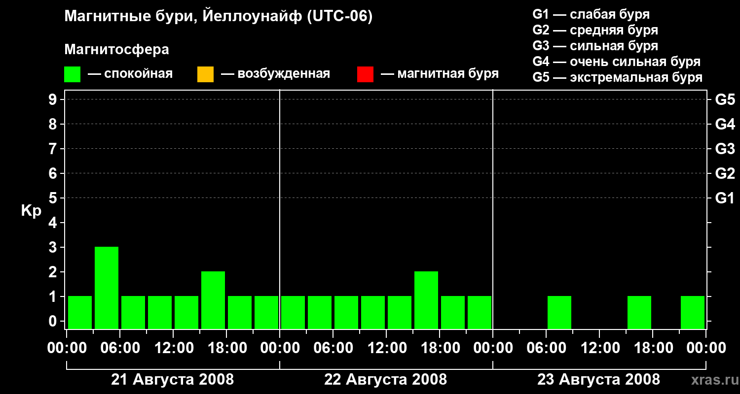 Изменения геомагнитного индекса Kp с 21 по 23 августа 2008 года для средних широт