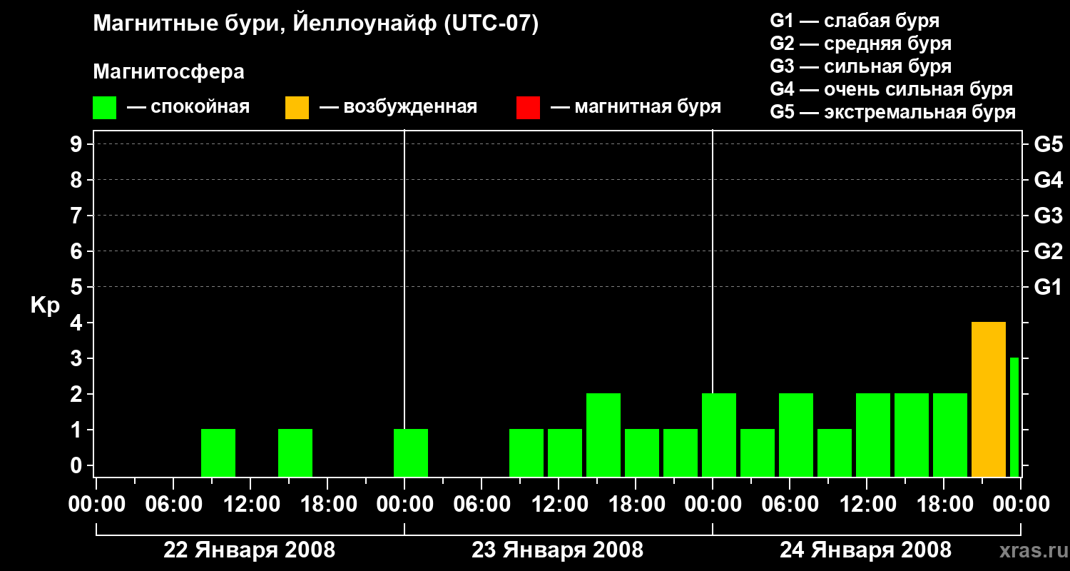 Изменения геомагнитного индекса Kp с 22 по 24 января 2008 года для средних широт