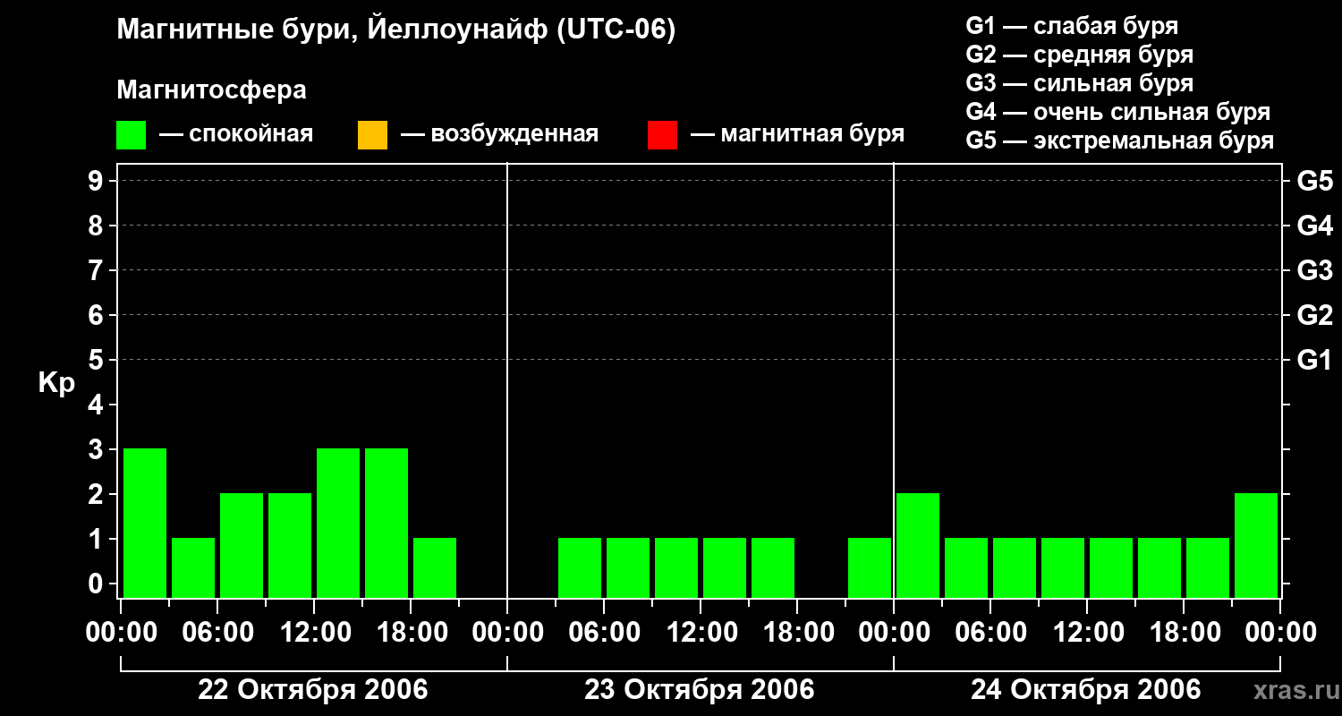 Изменения геомагнитного индекса Kp с 22 по 24 октября 2006 года для средних широт