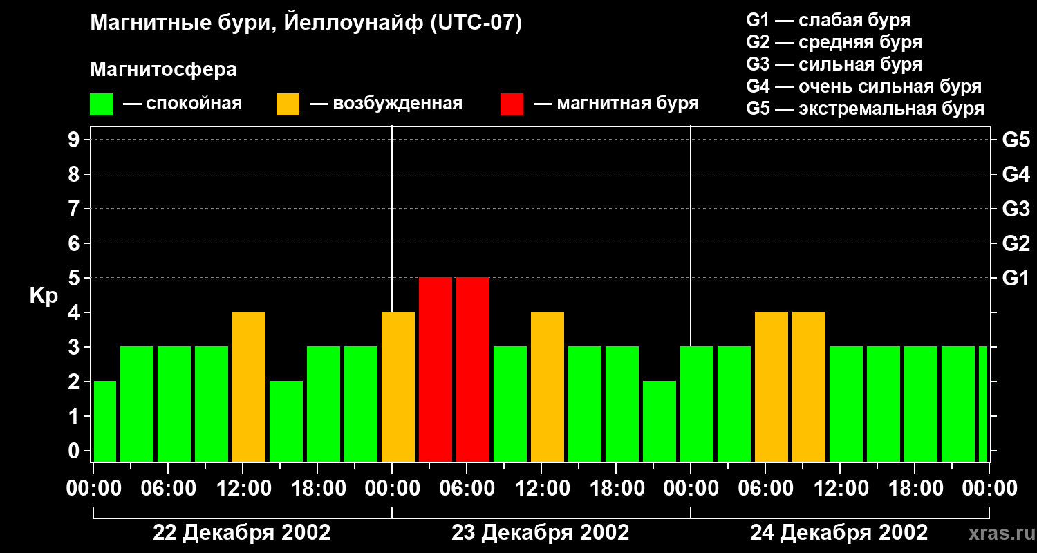 Изменения геомагнитного индекса Kp с 22 по 24 декабря 2002 года для средних широт