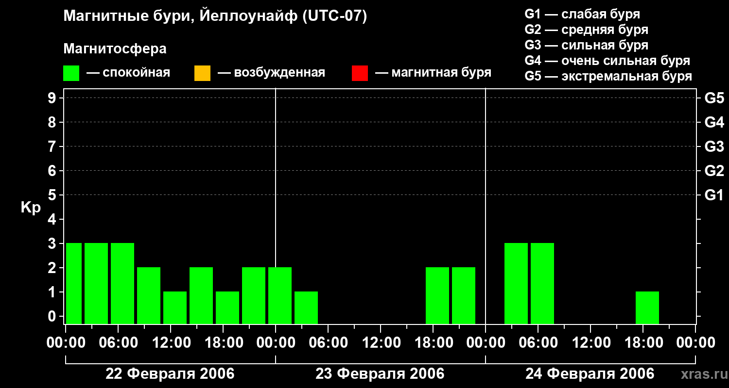 Изменения геомагнитного индекса Kp с 22 по 24 февраля 2006 года для средних широт