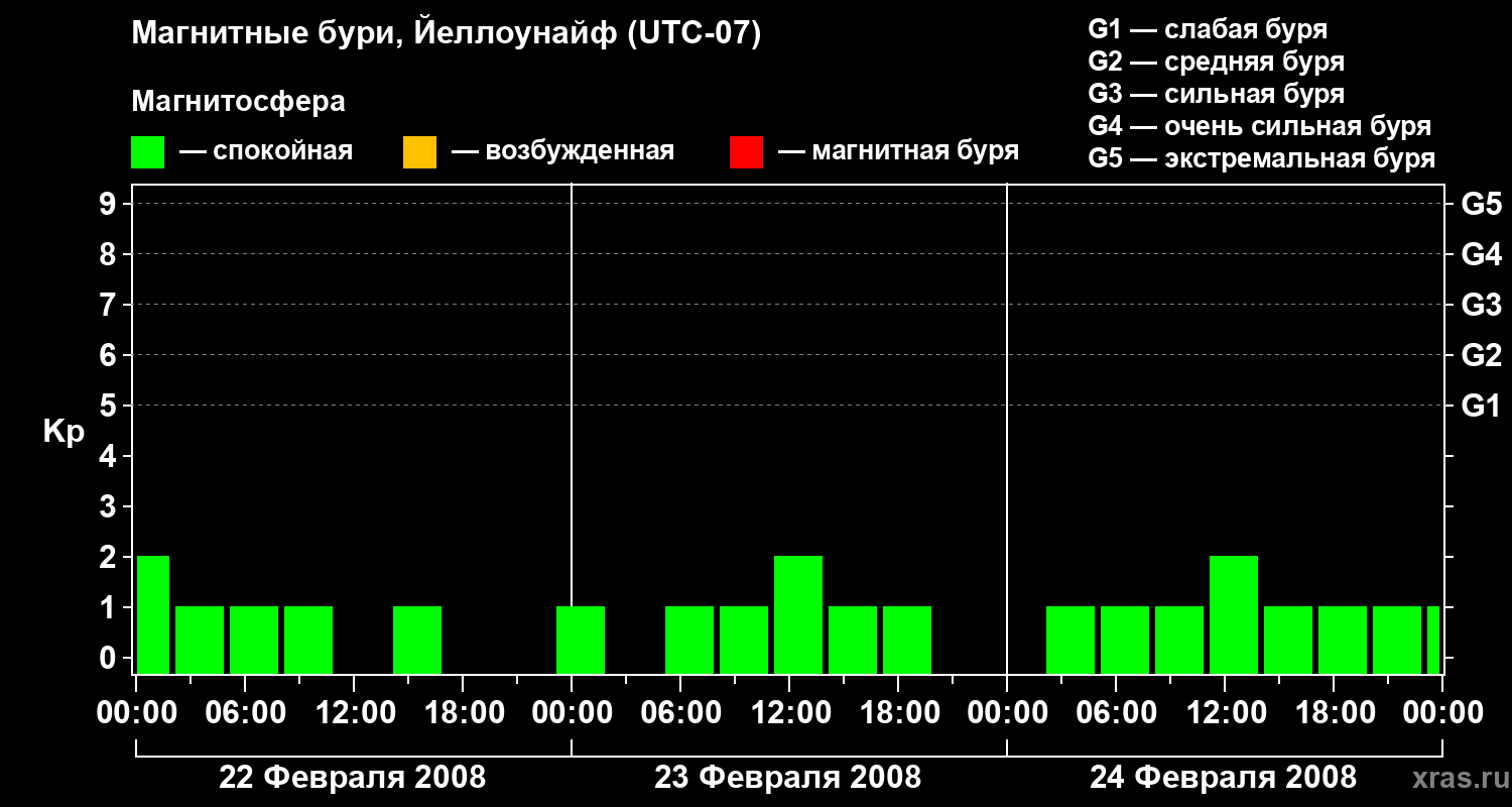 Изменения геомагнитного индекса Kp с 22 по 24 февраля 2008 года для средних широт