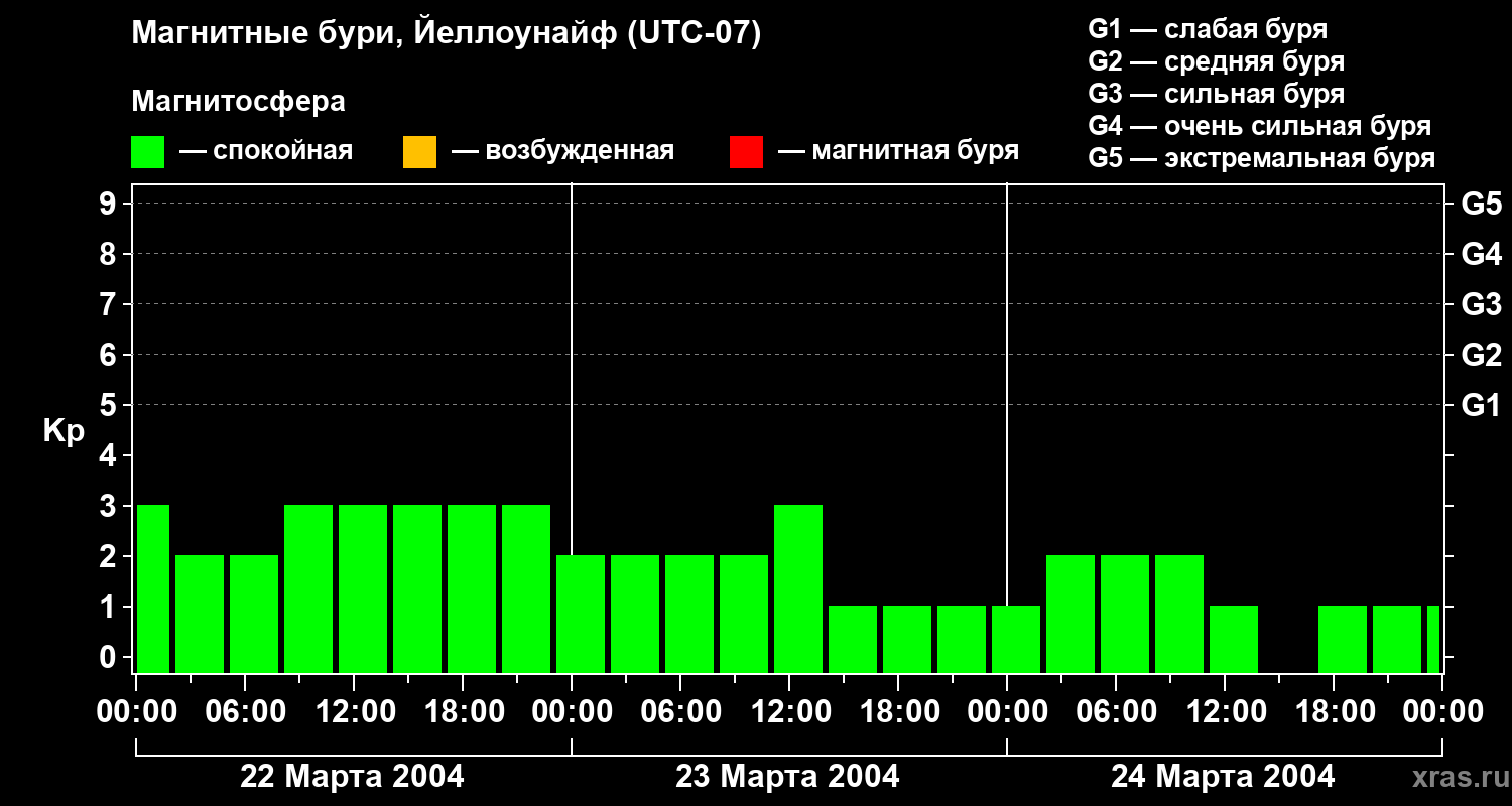 Изменения геомагнитного индекса Kp с 22 по 24 марта 2004 года для средних широт