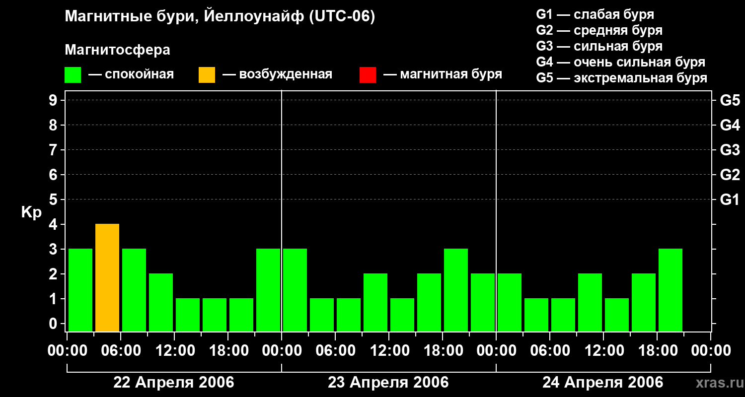 Изменения геомагнитного индекса Kp с 22 по 24 апреля 2006 года для средних широт