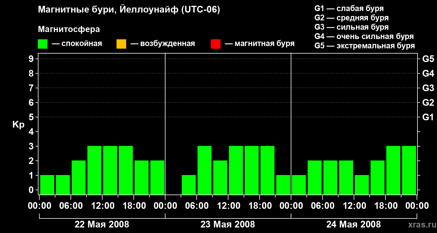 Изменения геомагнитного индекса Kp с 22 по 24 мая 2008 года для средних широт