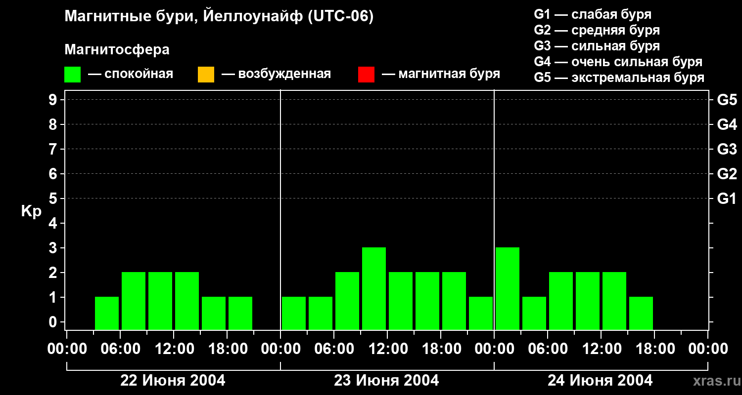 Изменения геомагнитного индекса Kp с 22 по 24 июня 2004 года для средних широт