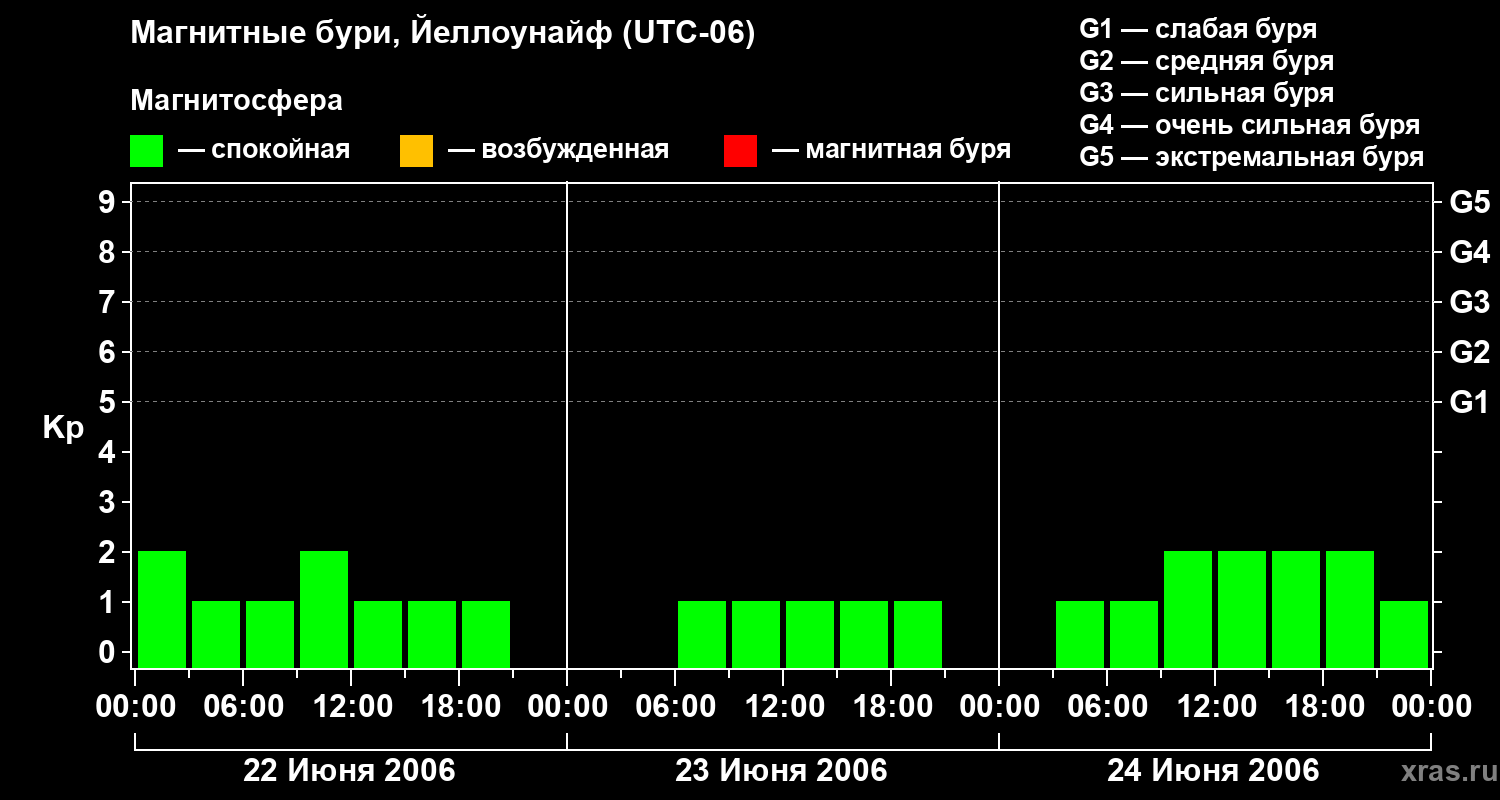 Изменения геомагнитного индекса Kp с 22 по 24 июня 2006 года для средних широт