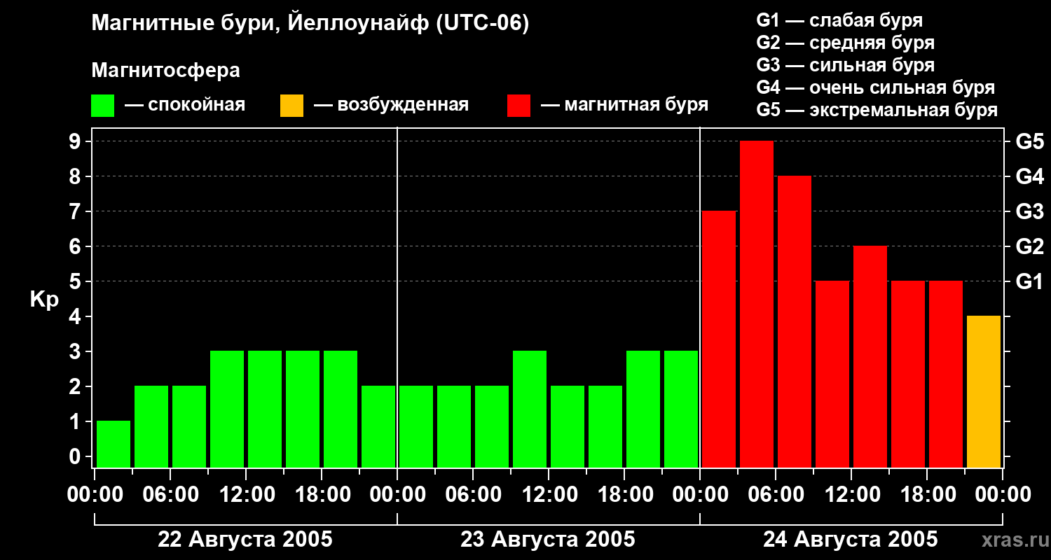 Изменения геомагнитного индекса Kp с 22 по 24 августа 2005 года для средних широт