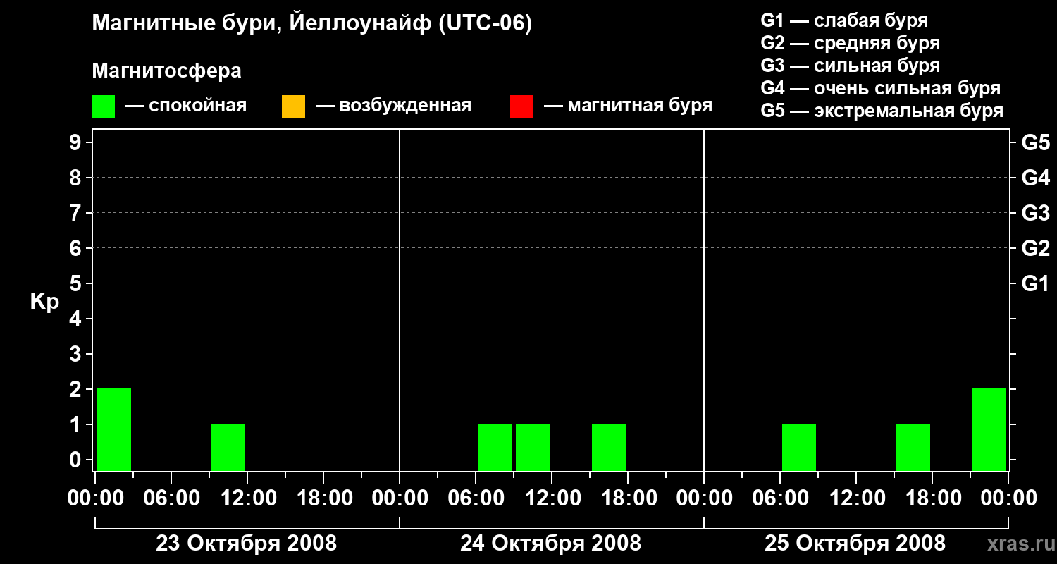Изменения геомагнитного индекса Kp с 23 по 25 октября 2008 года для средних широт