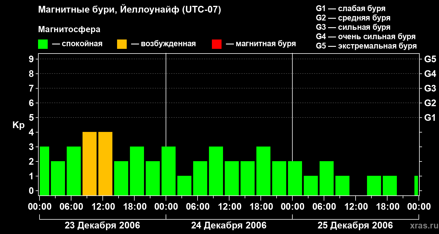 Изменения геомагнитного индекса Kp с 23 по 25 декабря 2006 года для средних широт