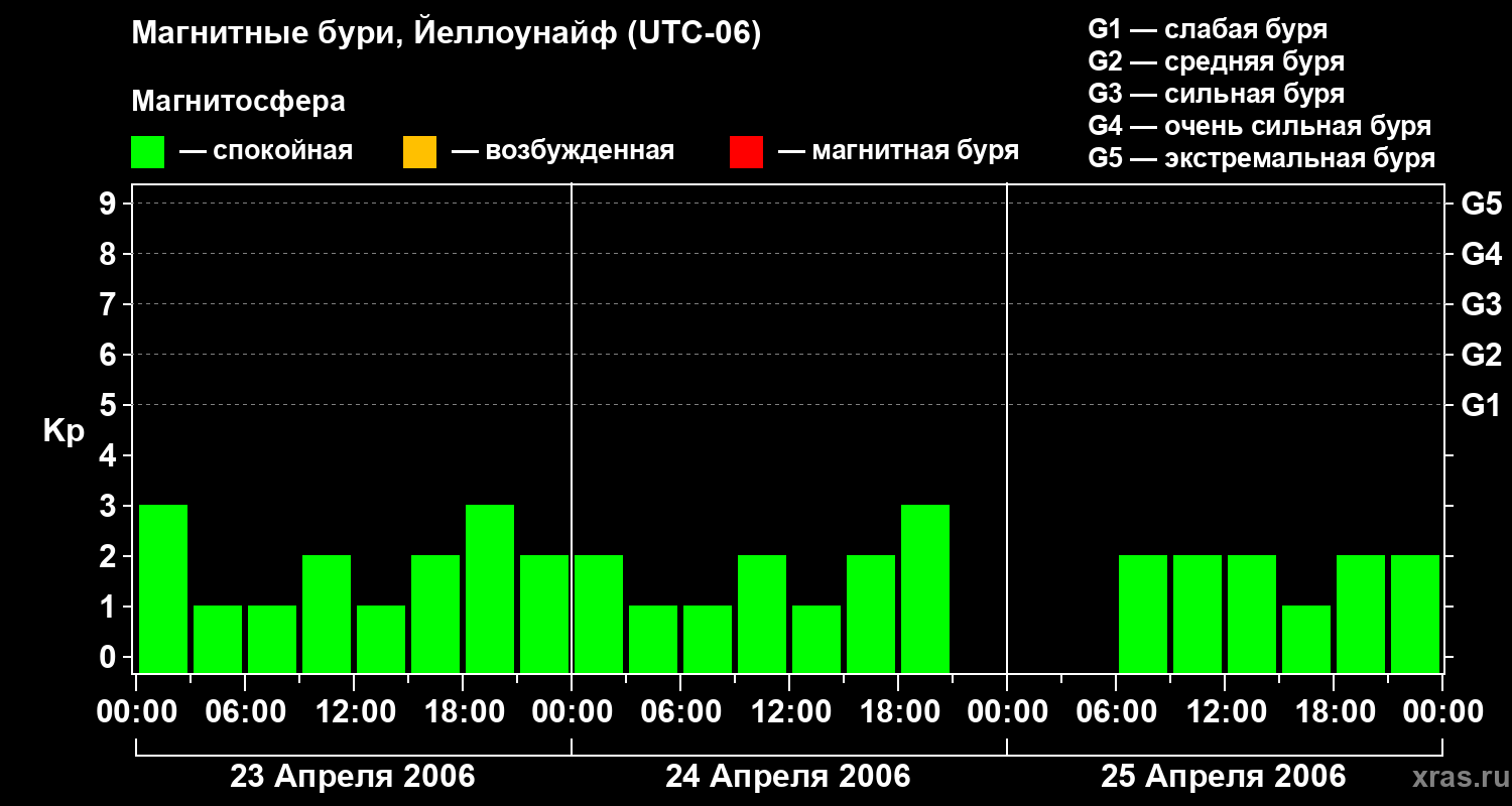 Изменения геомагнитного индекса Kp с 23 по 25 апреля 2006 года для средних широт