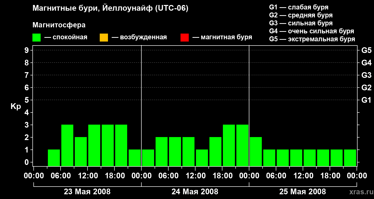 Изменения геомагнитного индекса Kp с 23 по 25 мая 2008 года для средних широт
