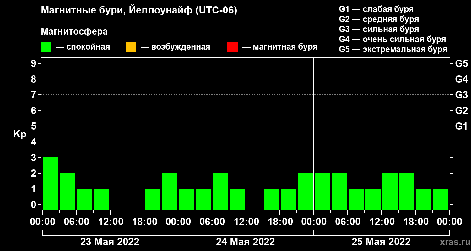 Изменения геомагнитного индекса Kp с 23 по 25 мая 2022 года для средних широт
