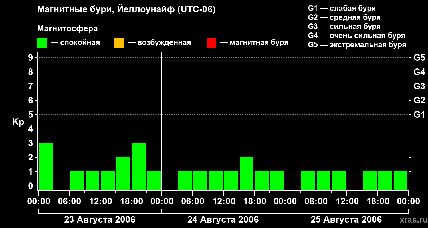 Изменения геомагнитного индекса Kp с 23 по 25 августа 2006 года для средних широт