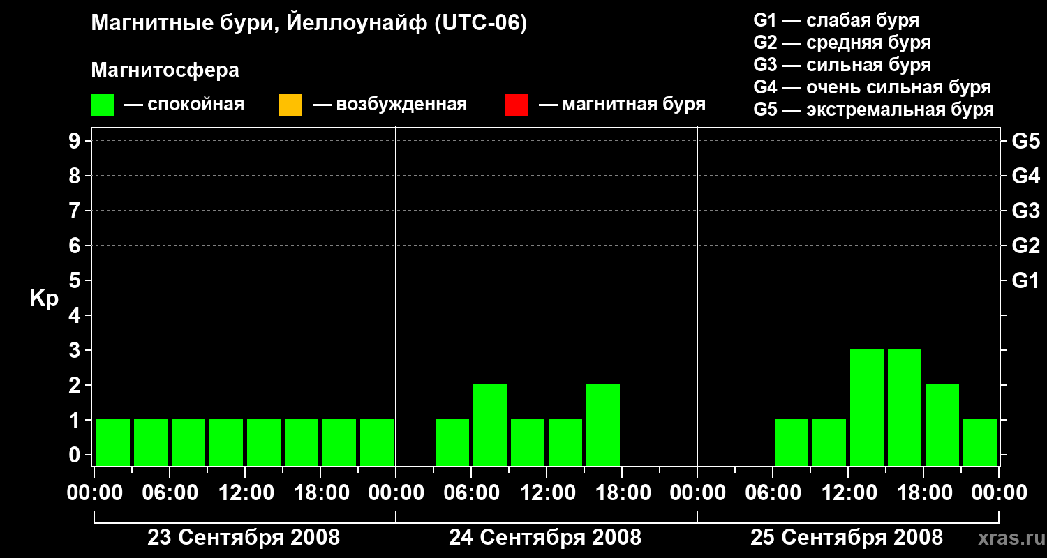 Изменения геомагнитного индекса Kp с 23 по 25 сентября 2008 года для средних широт