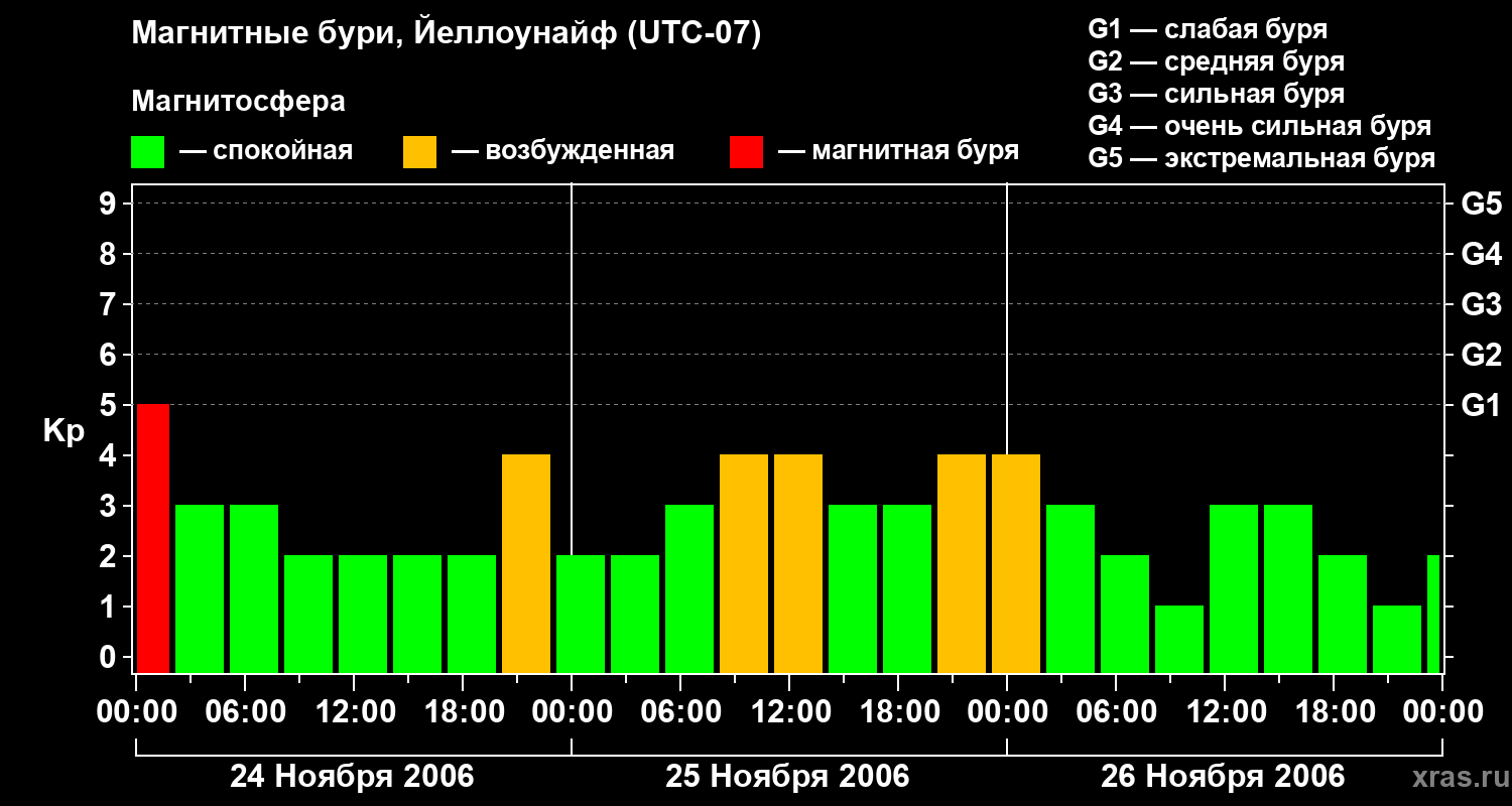 Изменения геомагнитного индекса Kp с 24 по 26 ноября 2006 года для средних широт