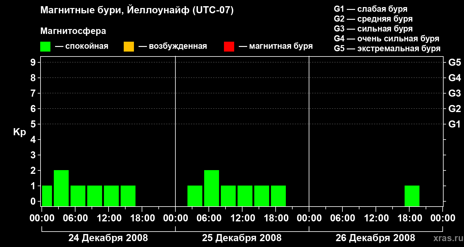 Изменения геомагнитного индекса Kp с 24 по 26 декабря 2008 года для средних широт