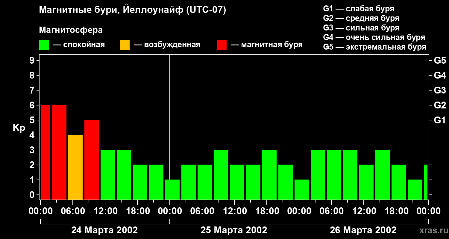 Изменения геомагнитного индекса Kp с 24 по 26 марта 2002 года для средних широт