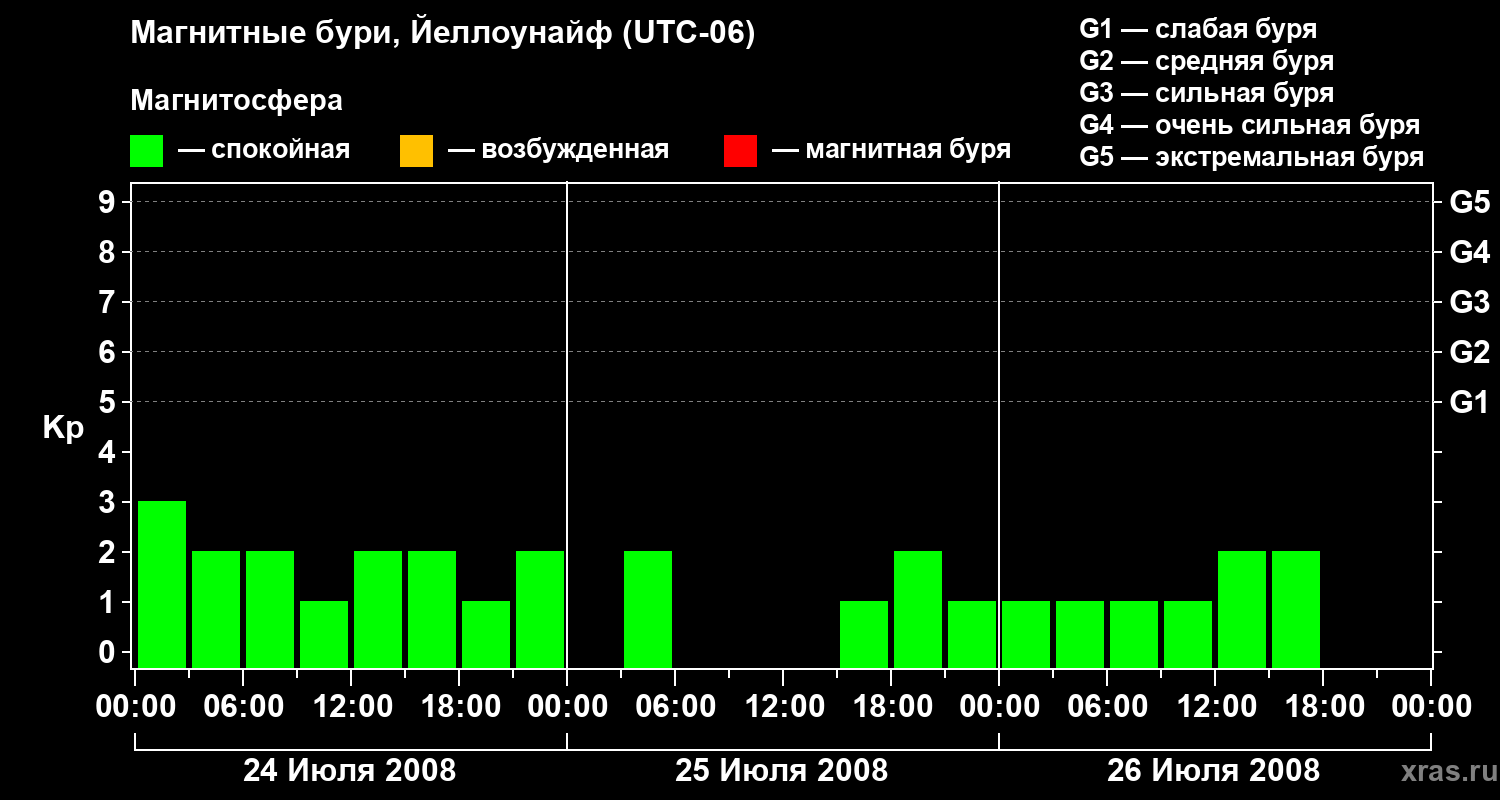 Изменения геомагнитного индекса Kp с 24 по 26 июля 2008 года для средних широт