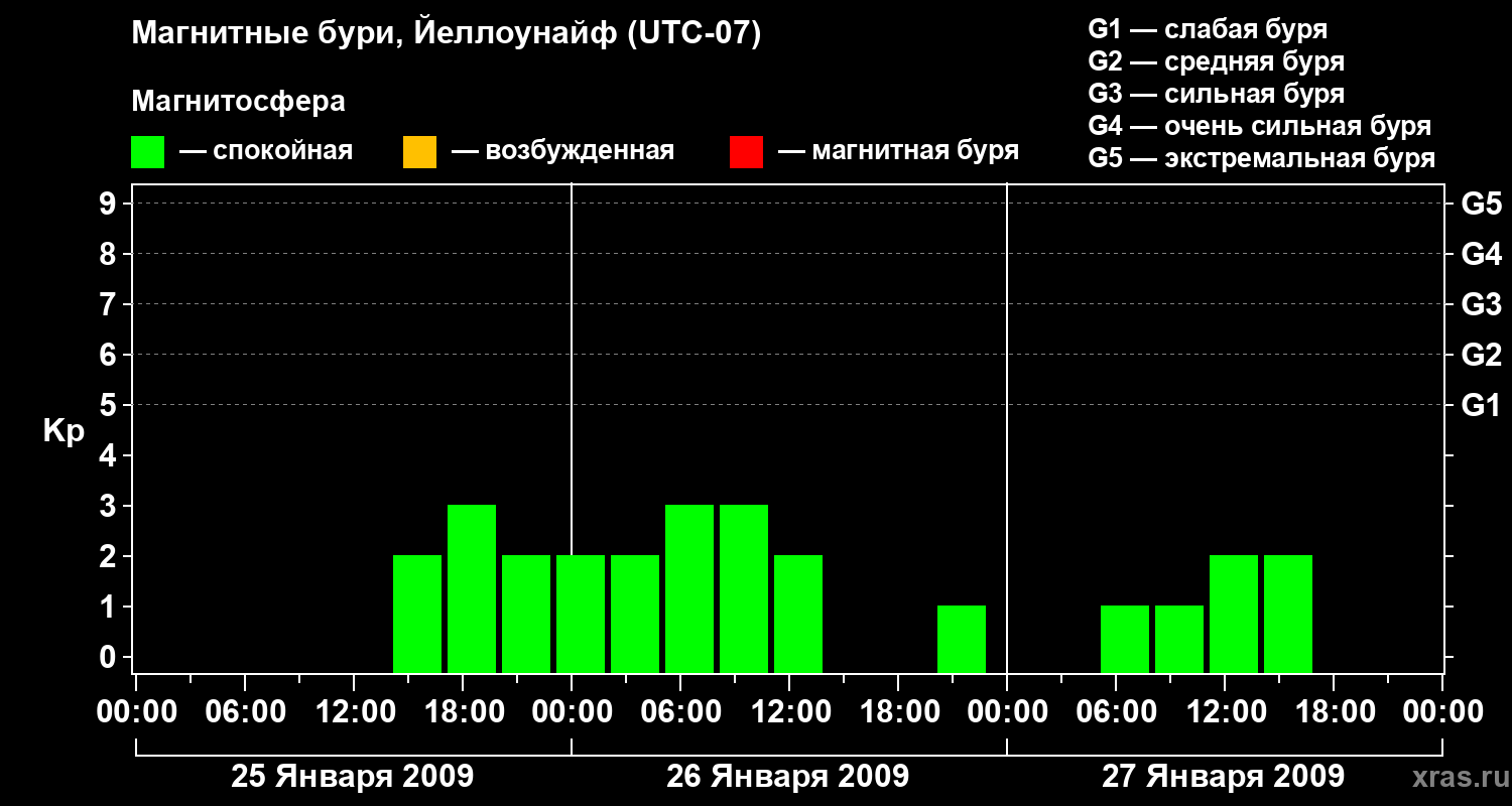 Изменения геомагнитного индекса Kp с 25 по 27 января 2009 года для средних широт