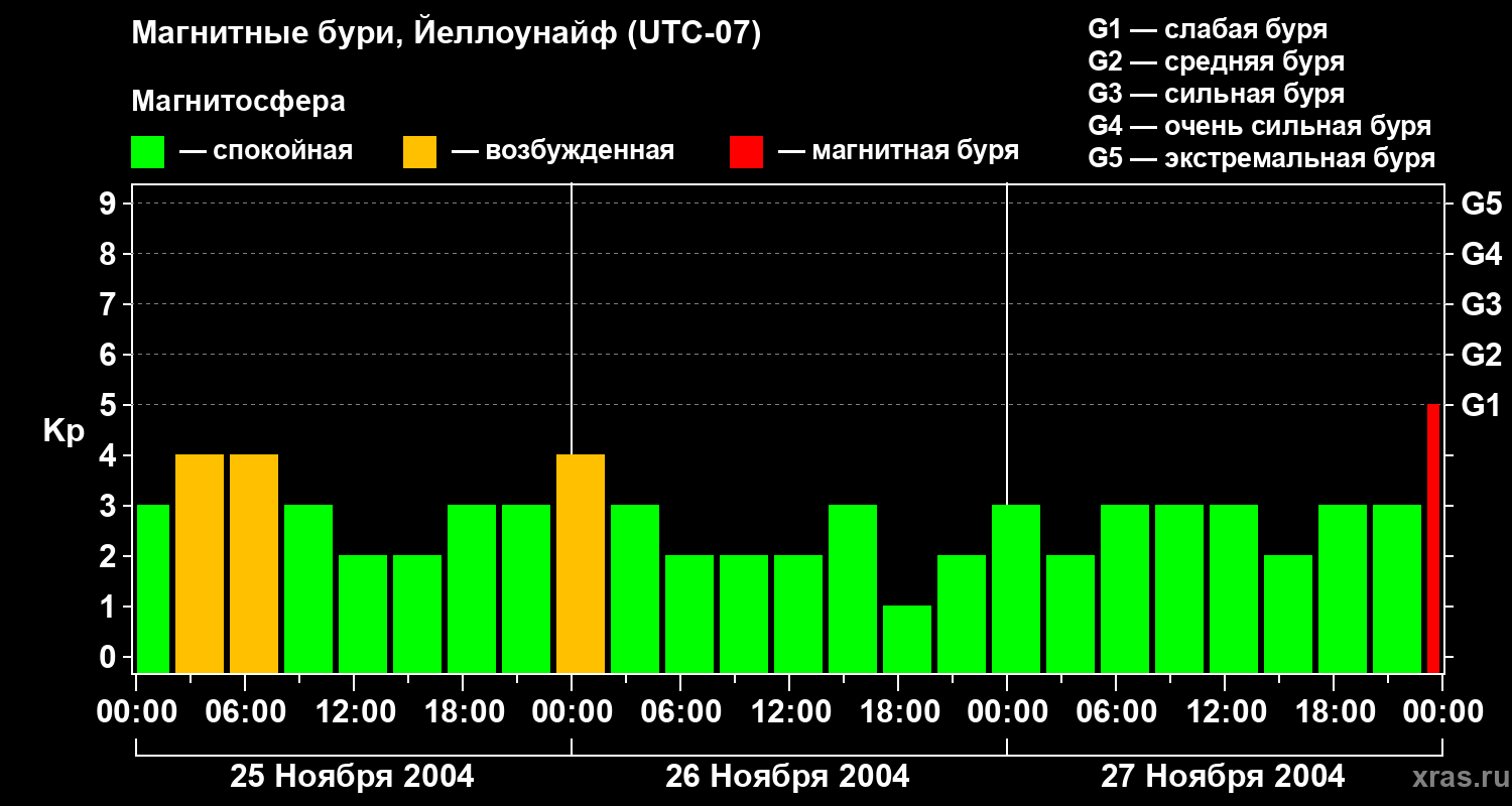 Изменения геомагнитного индекса Kp с 25 по 27 ноября 2004 года для средних широт