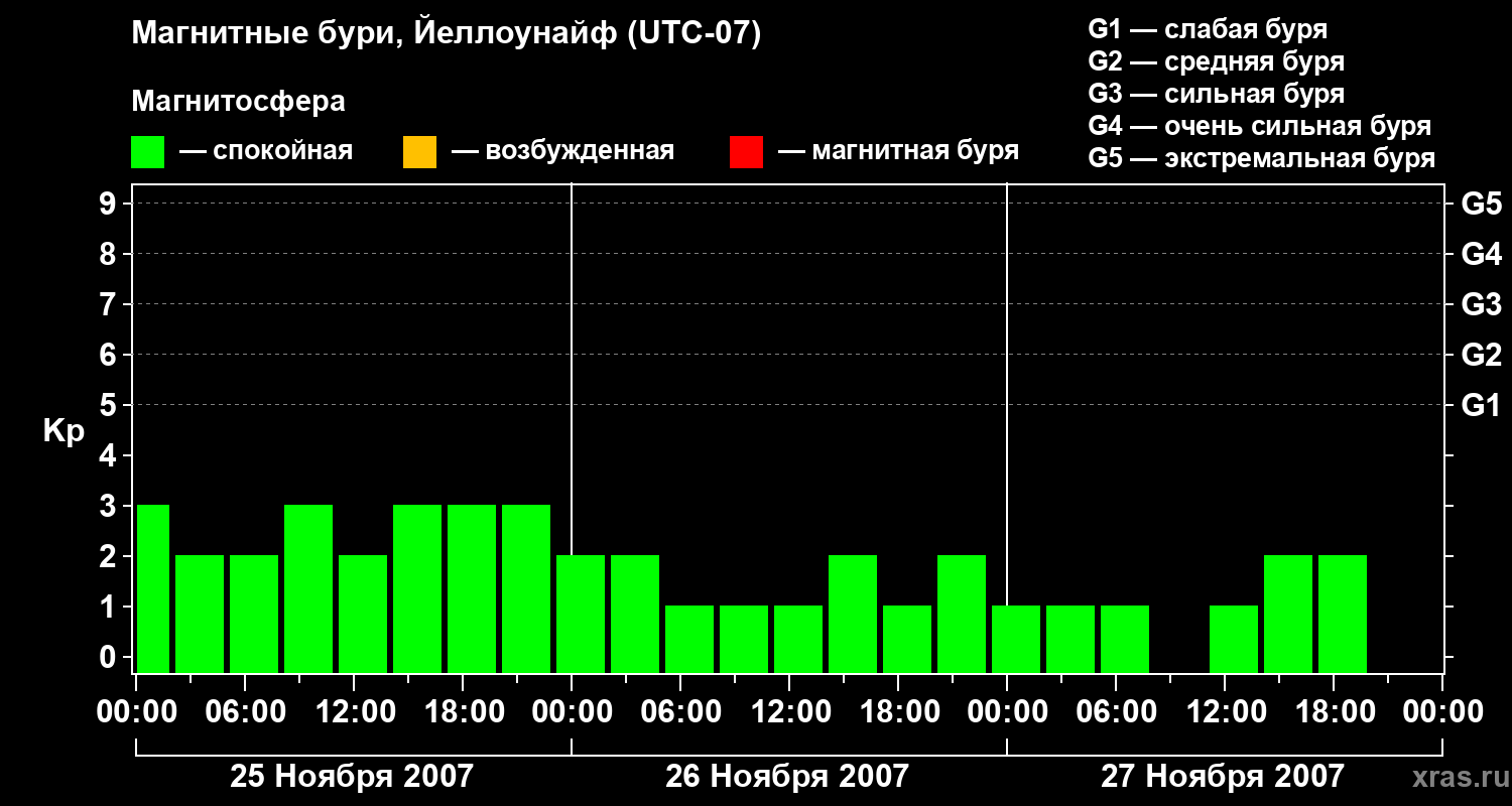 Изменения геомагнитного индекса Kp с 25 по 27 ноября 2007 года для средних широт