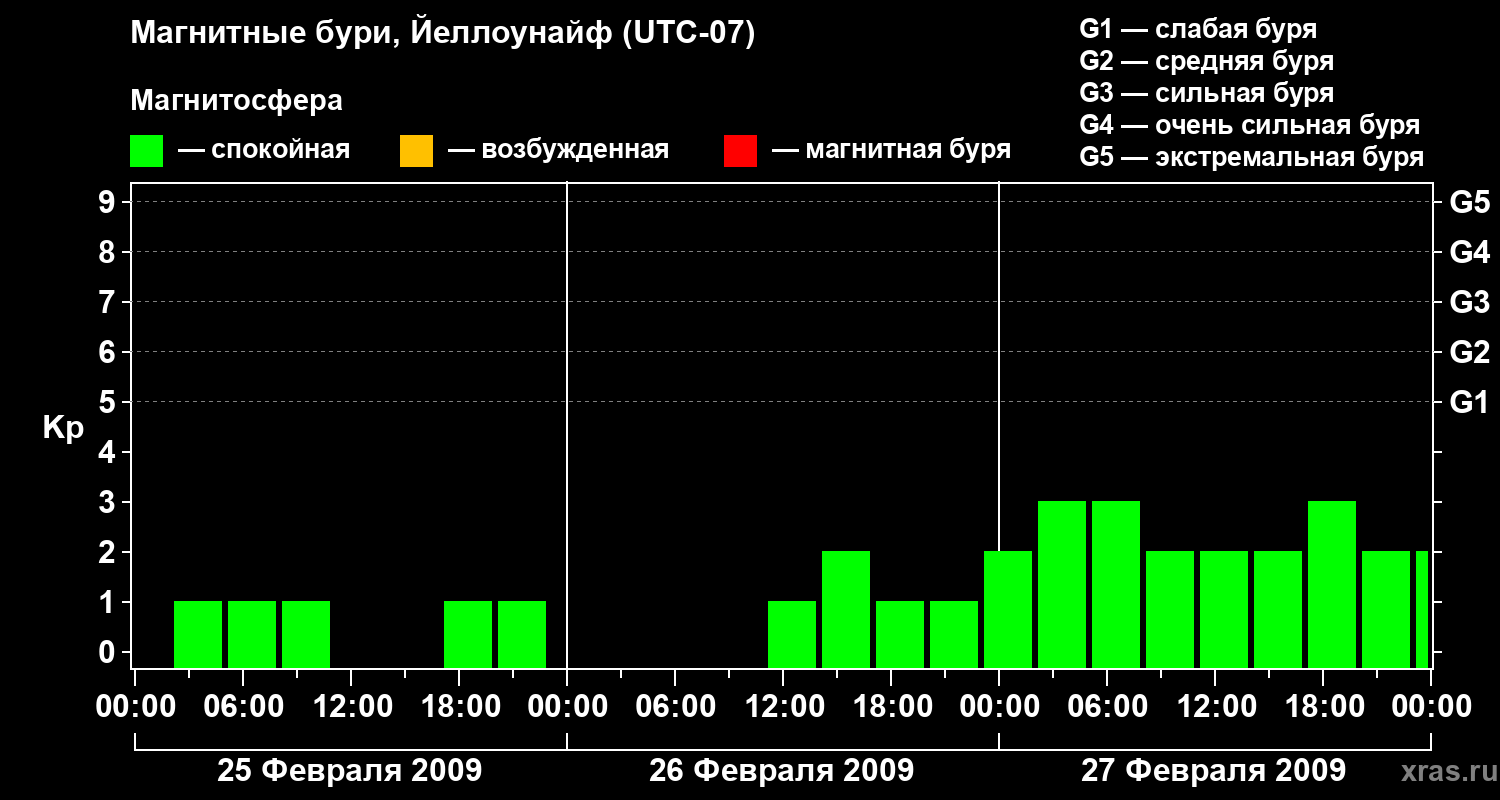 Изменения геомагнитного индекса Kp с 25 по 27 февраля 2009 года для средних широт