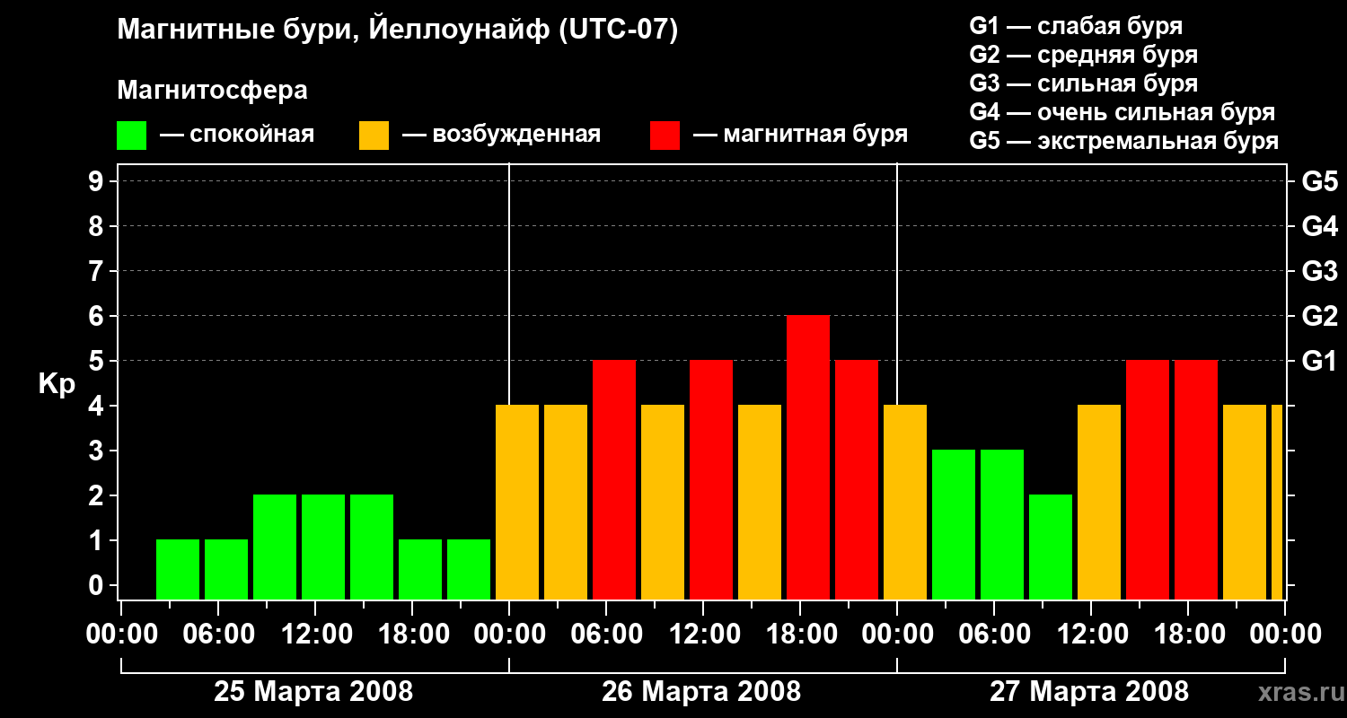 Изменения геомагнитного индекса Kp с 25 по 27 марта 2008 года для средних широт