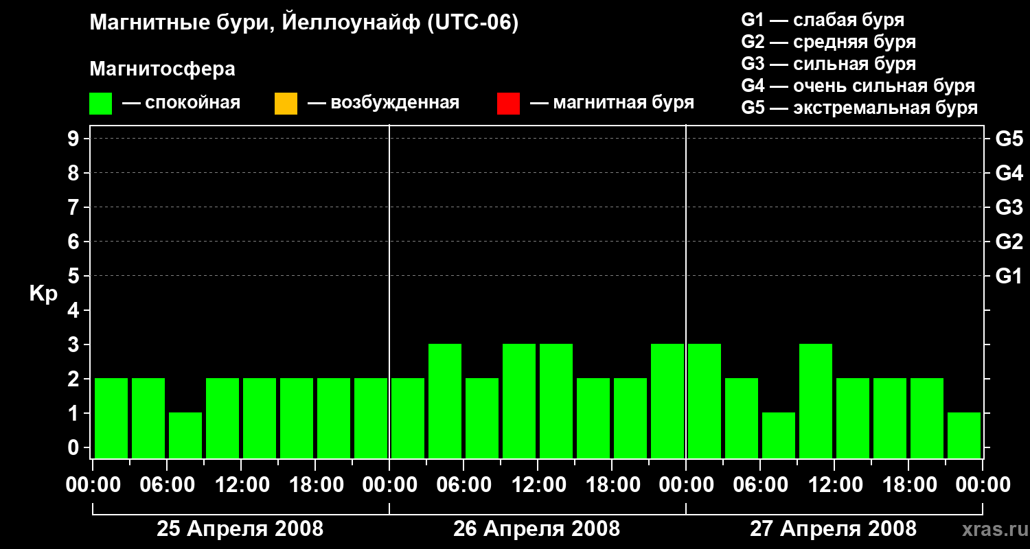 Изменения геомагнитного индекса Kp с 25 по 27 апреля 2008 года для средних широт