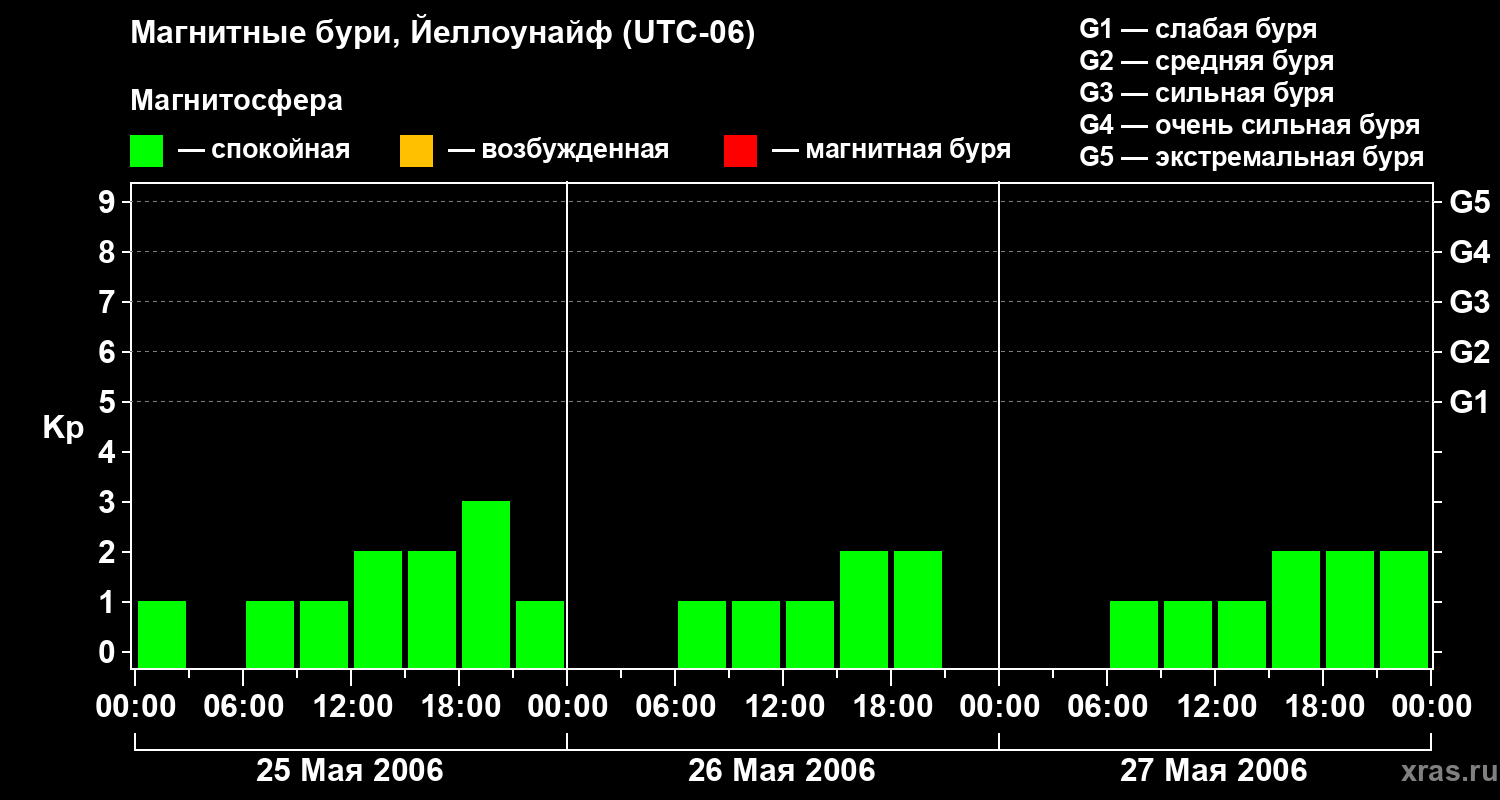 Изменения геомагнитного индекса Kp с 25 по 27 мая 2006 года для средних широт