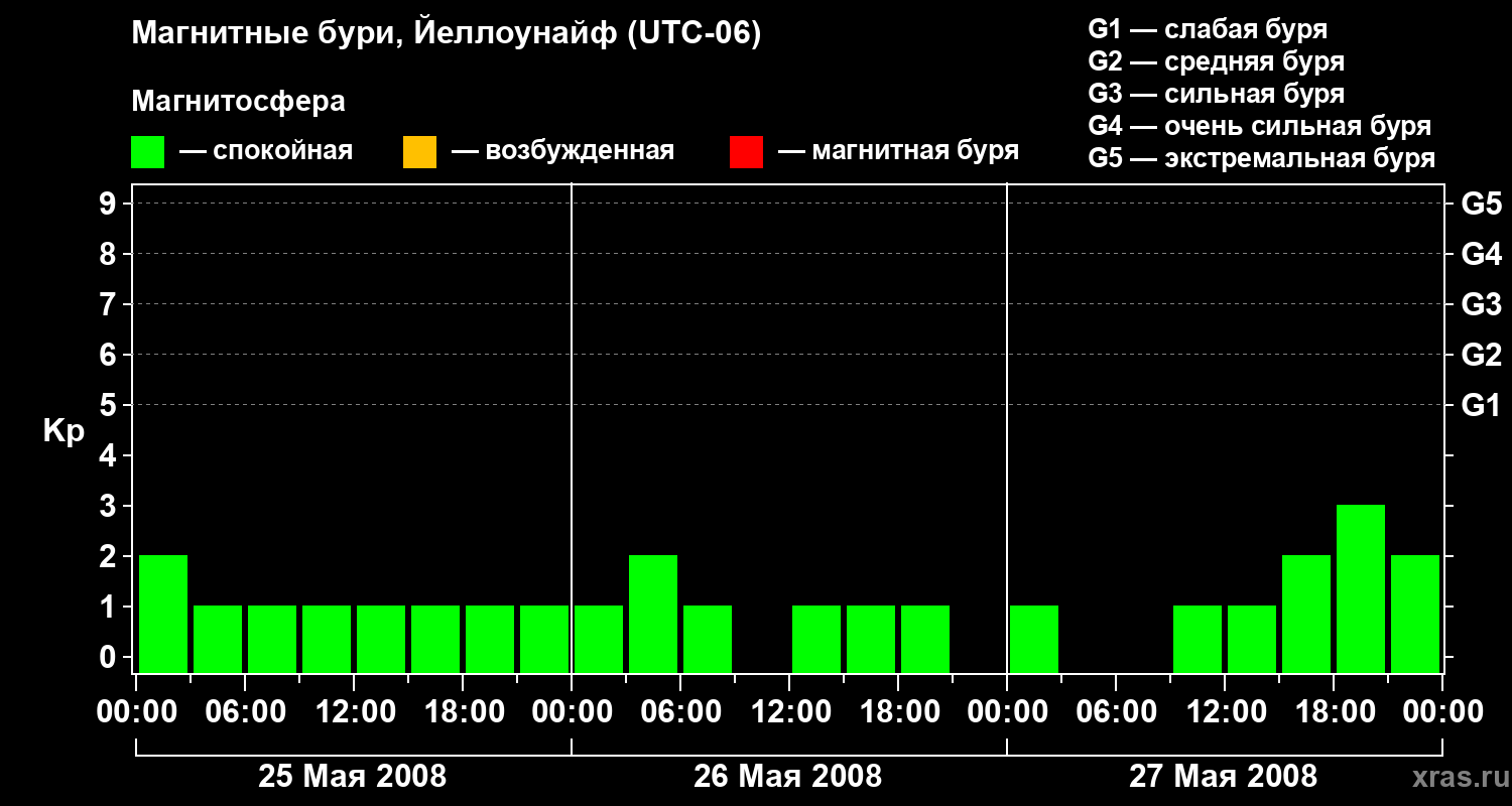 Изменения геомагнитного индекса Kp с 25 по 27 мая 2008 года для средних широт