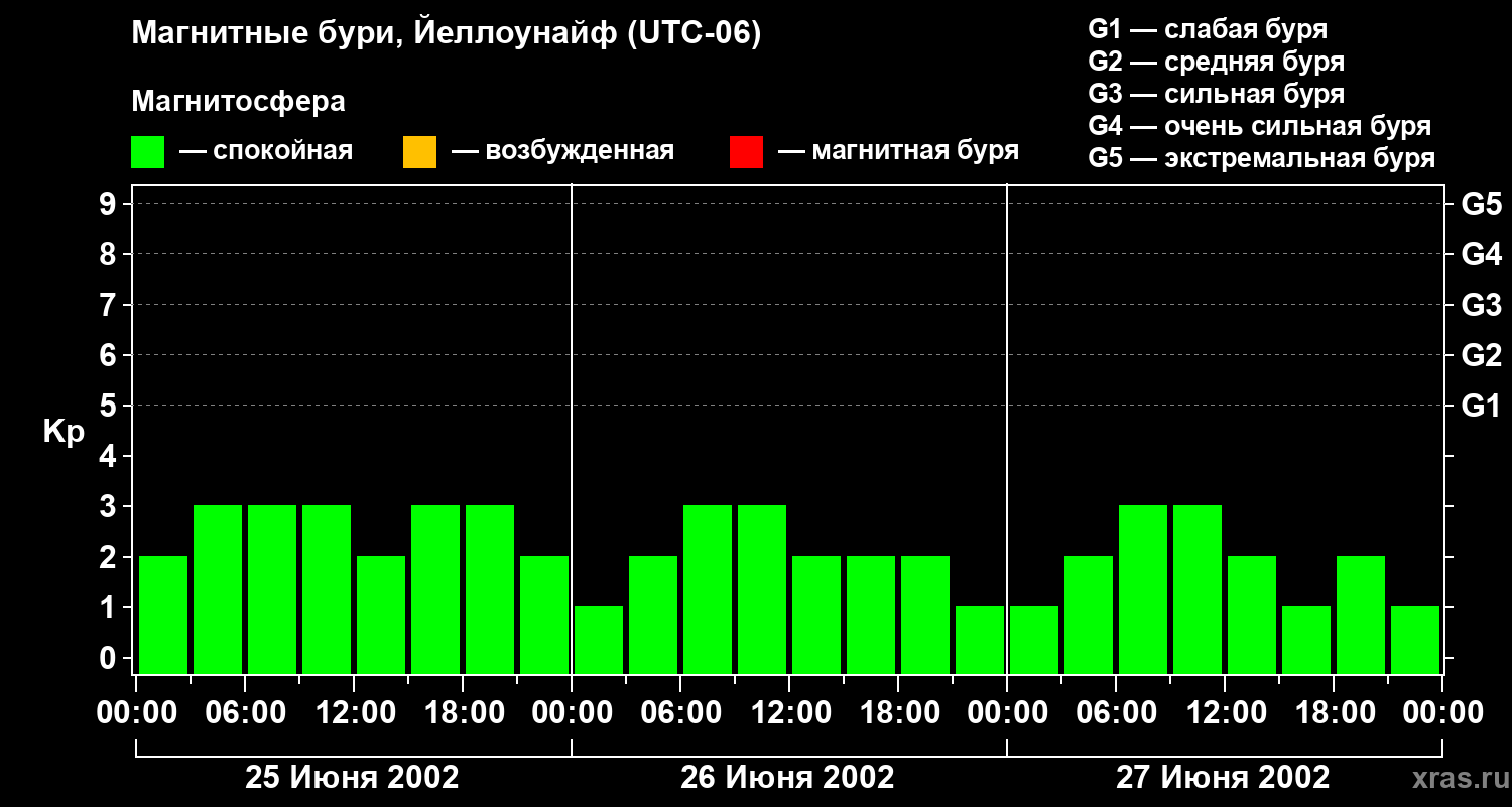 Изменения геомагнитного индекса Kp с 25 по 27 июня 2002 года для средних широт