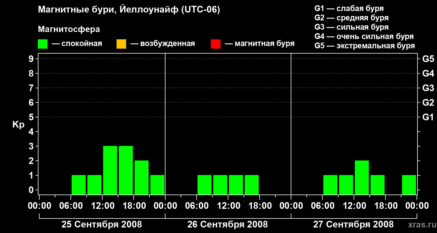 Изменения геомагнитного индекса Kp с 25 по 27 сентября 2008 года для средних широт