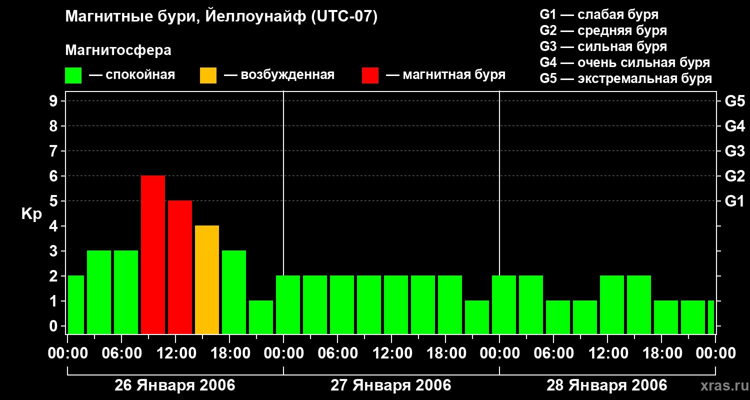 Изменения геомагнитного индекса Kp с 26 по 28 января 2006 года для средних широт