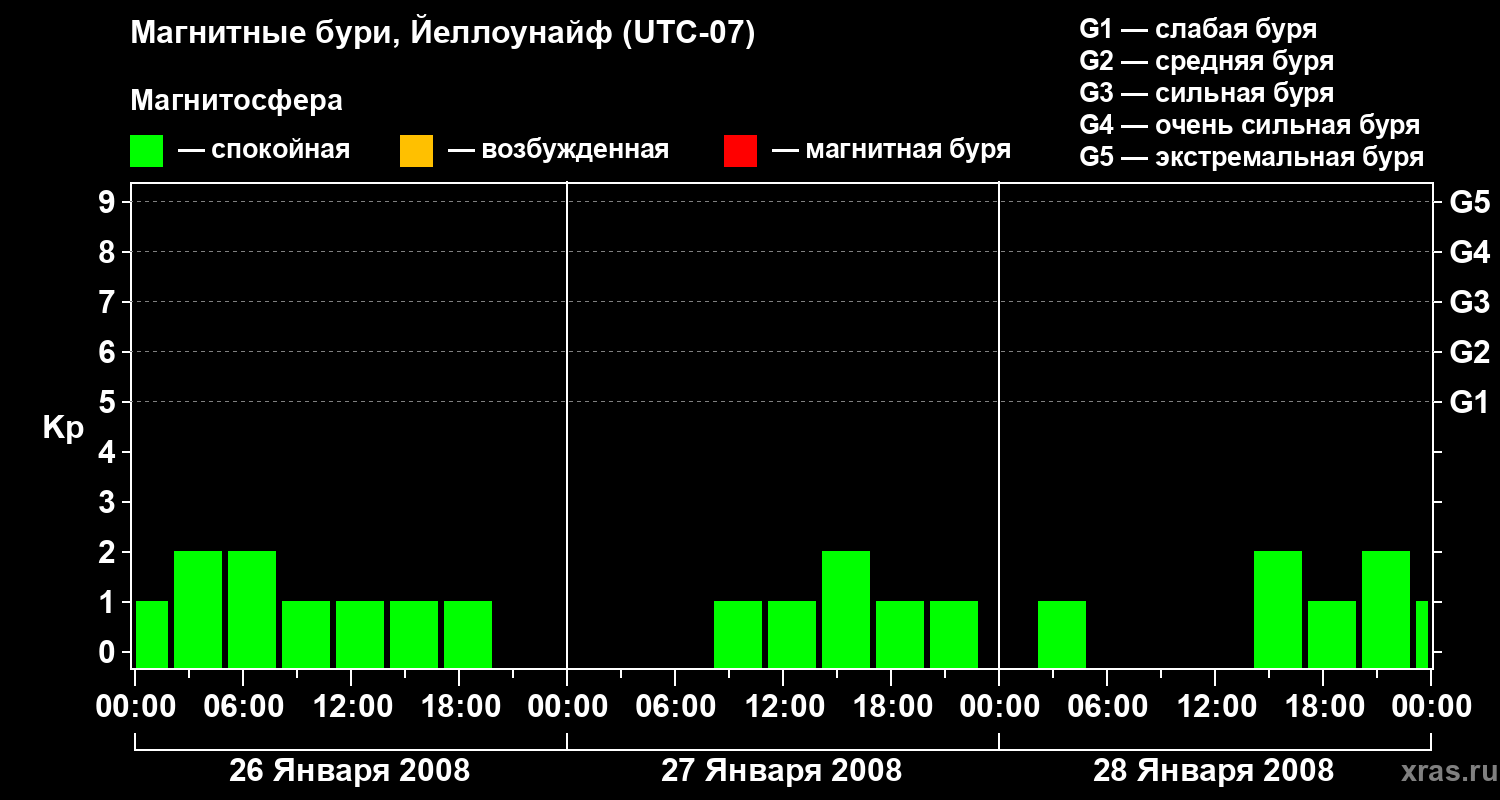 Изменения геомагнитного индекса Kp с 26 по 28 января 2008 года для средних широт